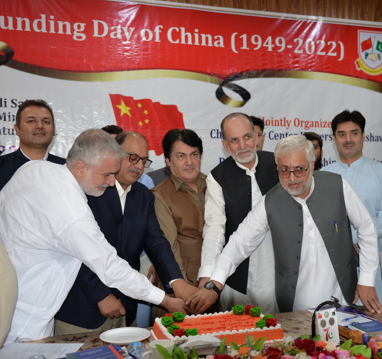 Mr Sayed Ali Nawaz Gilani General Secretary Pakistan China Friendship Association KP Chapter in his speech said that Pakistan and China Relations have strengthened with passage of time. Syed Ali Nawaz Gilani Secretary-General PCFA & President Radio China Listener’s Club Peshawar while speaking on the occasion said China is now Rising and Shining across the globe due to its systems and this is a great lesson to learn which is the need of the hour. While celebrating 73rd Founding Day of the People’s Republic of China today we should also follow our time tested friendly advice. There are rich opportunities in Khyber Pakhtunkhwa Province to move ahead for socio economic developments. Traditionally the relations with China are very old. Peshawar Urumqi and Abbottabad Kashgar are sister cities since 1985 and 2007 respectively. The Provincial Cabinet already approved twinning to other cities which will soon be finalized and open a new chapter of Friendship and we can benefit from Chinese experience in various fields for mutual interest. He particularly highlighted the role of the CPC in making China a great economic and political power. After the speech of the Chief Guest the cake cutting ceremony took place which was followed by a group photo and refreshments. In the question answer session it was suggested that to ease trade and strengthen people to people contact flights from Peshawar to Urumqi and Kashgar ( Kashi) should be started. The Director of the China Study Center thanked the Chief Guest, distinguished speakers and other participants for their sparing time on weekend to come and participate in the Independence Day celebrations of China. A large number of officials, pro Vice Chancellors, Deans, experts on China, faculty and students participated in the event.