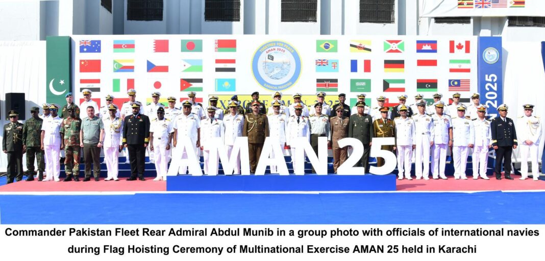 Karachi: An impressive and colourful flag-hoisting ceremony was held at Pakistan Navy Dockyard, Karachi, marking the formal inauguration of the 9th Multinational Maritime Exercise AMAN 2025. The event featured the simultaneous hoisting of flags from all participating nations. A large number of senior military representatives, observers, diplomats, and officials from Pakistan Armed Forces attended the ceremony.