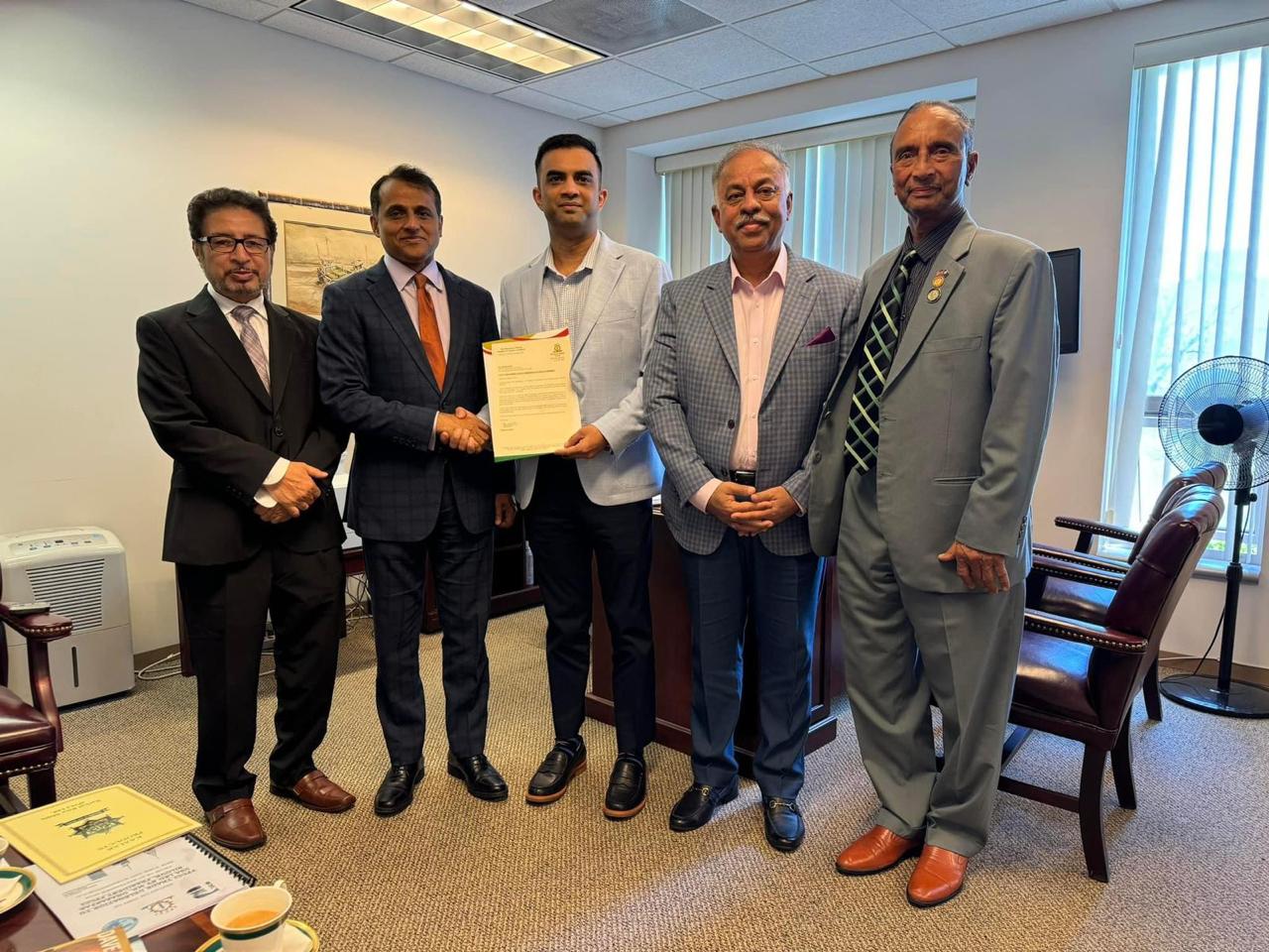 Mr.Mohammad Hanif Channa Minister Trade & Investment Embassy of Pakistan Washington DC USA giving appointment letter to Mr.Najeeb Choudary Founder & Principal Metro Management USA Ambassador on Trade & Investment Washington DC,Maryland and Virginia The Federation of Pakistan Chamber of Commerce & Industry (FPCCI) on behalf of Sheikh Atif Ikram President FPCCI. Malik Sohail Hussain Chairman Coordination FPCCI & Secretary General USPICC,Mr Saddique Sheikh Founder President & Chairman USPICC and Zahid Hussain Editor In Chief Dunya Newspaper USA are also present at the occasion in Pakistan Embassy Washington DC.