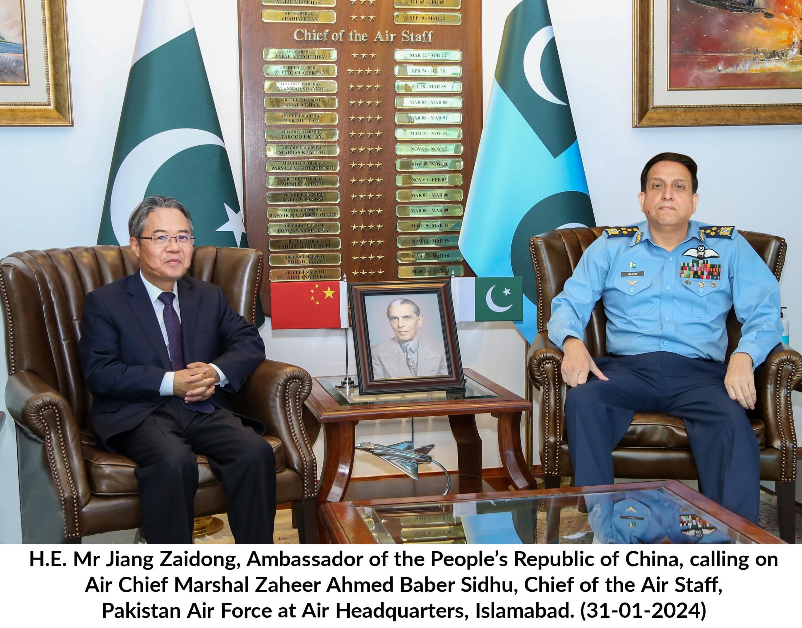 Islamabad: Ambassador of the People’s Republic of China, H.E. Mr Jiang Zaidong, called on Air Chief Marshal Zaheer Ahmed Baber Sidhu, Chief of the Air Staff, Pakistan Air Force in his office today. During the meeting matters pertaining to evolving geo-strategic environment and regional developments were discussed. The dignitaries underscored the necessity of revitalizing the framework for operational training across all domains, emphasizing the paramount importance of preparedness and seamless coordination in the face of evolving security challenges.