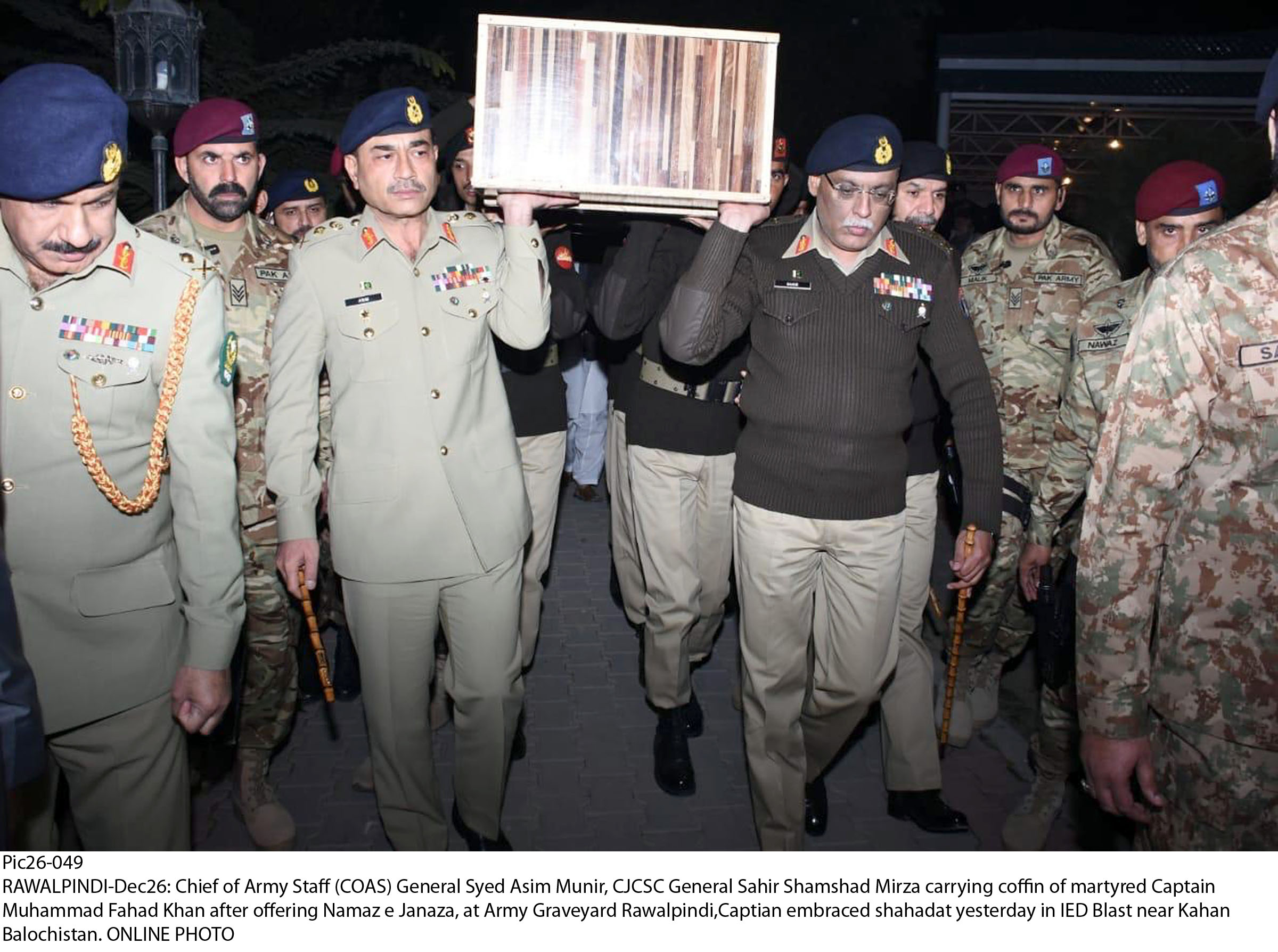 RAWALPINDI : Chief of Army Staff Gen Syed Asim Munir and Chairman Joint Chiefs of Staff Committee (CJCSC) Gen Sahir Shamshad Mirza on Monday attended the funeral prayer of Captain Fahad who embraced martyrdom in Balochistan’s Kahan area during a clearance operation.
