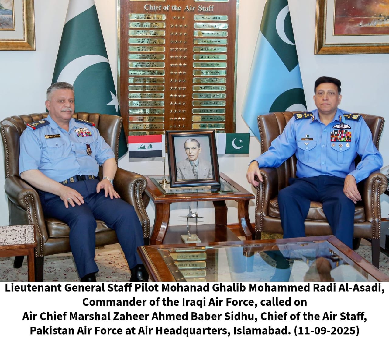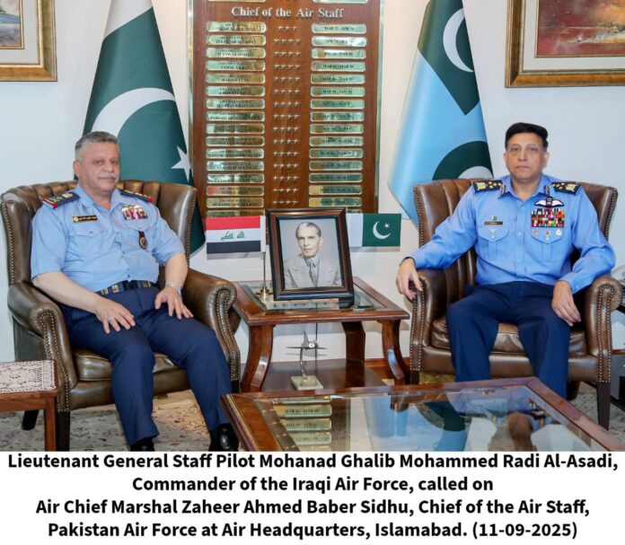 Spokesman Report,11 September, 2025: A high-level defence delegation led by Lieutenant General Staff Pilot Mohanad Ghalib Mohammed Radi Al-Asadi, Commander of the Iraqi Air Force, called on Air Chief Marshal Zaheer Ahmed Baber Sidhu, Chief of the Air Staff, Pakistan Air Force at Air Headquarters, Islamabad.The meeting covered various prospects of mutual cooperation between the two brotherly nations, placing special emphasis on joint training, capacity building and advancements in the aviation industry.