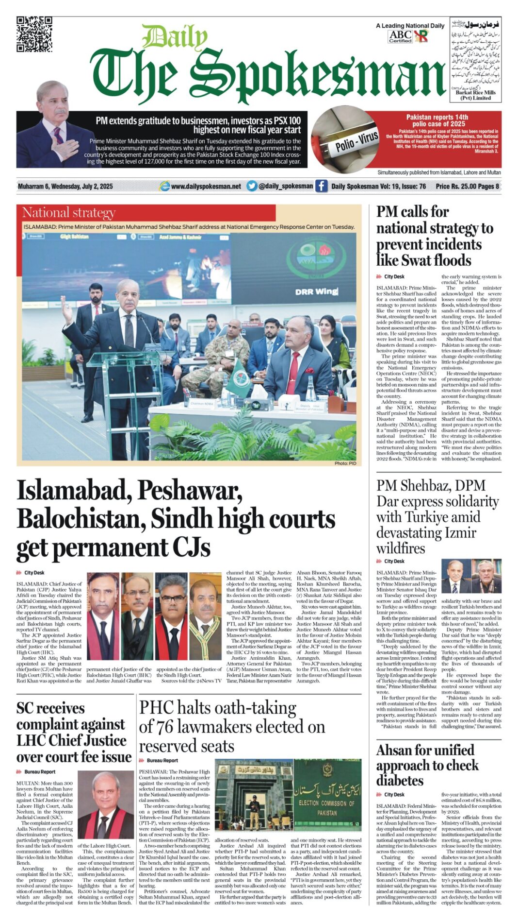 Daily The Spokesman PDF Daily The Spokesman 02 July 2025 PDF By News Desk July 2, 2025 0 465 Share FacebookTwitterPinterestWhatsAppLinkedinEmailTelegram Must read Daily The Spokesman 17 December 2025 PDF December 17, 2025 Daily The Spokesman 16 December 2025 PDF December 16, 2025 Kenya marks 62nd Jamhuri Day in Islamabad, Reaffirms strong ties with Pakistan December 15, 2025 Daily The Spokesman 15 December 2025 PDF December 15, 2025 News Deskhttps://dailyspokesman.net/live Daily The Spokesman 02 July 2025 PDF TagsDaily The Spokesman 02 July 2025 PDF Share FacebookTwitterPinterestWhatsAppLinkedinEmailTelegram Previous articleFatima Fertilizer’s Sarsabz Tabeer launches healthcare initiative in collaboration with MASH and the Government of PunjabNext articleUNHCR powers Bolan Medical Complex with 684kW solar energy system, saving Rs. 70 million annually - Advertisement - More articles Daily The Spokesman 17 December 2025 PDF December 17, 2025 Daily The Spokesman 16 December 2025 PDF December 16, 2025 Daily The Spokesman 15 December 2025 PDF December 15, 2025 - Advertisement - Latest article Daily The Spokesman 17 December 2025 PDF December 17, 2025 Daily The Spokesman 16 December 2025 PDF December 16, 2025 Kenya marks 62nd Jamhuri Day in Islamabad, Reaffirms strong ties with Pakistan December 15, 2025 Daily The Spokesman 15 December 2025 PDF December 15, 2025 Daily The Spokesman 14 December 2025 PDF December 14, 2025