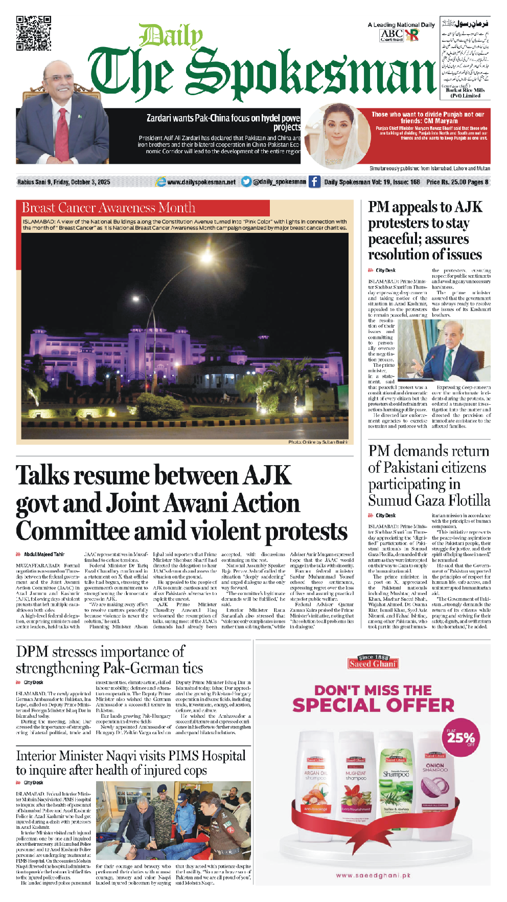 Daily The Spokesman PDF Daily The Spokesman 03 October 2025 PDF By News Desk October 3, 2025 0 97 Share FacebookTwitterPinterestWhatsAppLinkedinEmailTelegram Must read Daily The Spokesman 05 December 2025 PDF December 5, 2025 Wasim Aslam Appointed Coordinator to Chairman PMYP for Azad Jammu & Kashmir December 5, 2025 Hope 4 Humanity Gears Up for Pakistan Visit After Productive Meeting with High Commissioner December 4, 2025 Historic Visit: Pakistan and Kyrgyzstan Pen Agreements Across Energy, Mining, and Culture December 4, 2025 News Deskhttps://dailyspokesman.net/live Daily The Spokesman 03 October 2025 PDF TagsDaily The Spokesman 03 October 2025 PDF Share FacebookTwitterPinterestWhatsAppLinkedinEmailTelegram Previous articleDaily The Spokesman 02 October 2025 PDFNext articleDaily The Spokesman 04 October 2025 PDF - Advertisement - More articles Daily The Spokesman 05 December 2025 PDF December 5, 2025 Daily The Spokesman 04 December 2025 PDF December 4, 2025 Daily The Spokesman 03 December 2025 PDF December 3, 2025 - Advertisement - Latest article Daily The Spokesman 05 December 2025 PDF December 5, 2025 Wasim Aslam Appointed Coordinator to Chairman PMYP for Azad Jammu & Kashmir December 5, 2025 Hope 4 Humanity Gears Up for Pakistan Visit After Productive Meeting with High Commissioner December 4, 2025 Historic Visit: Pakistan and Kyrgyzstan Pen Agreements Across Energy, Mining, and Culture December 4, 2025 Daily The Spokesman 04 December 2025 PDF December 4, 2025