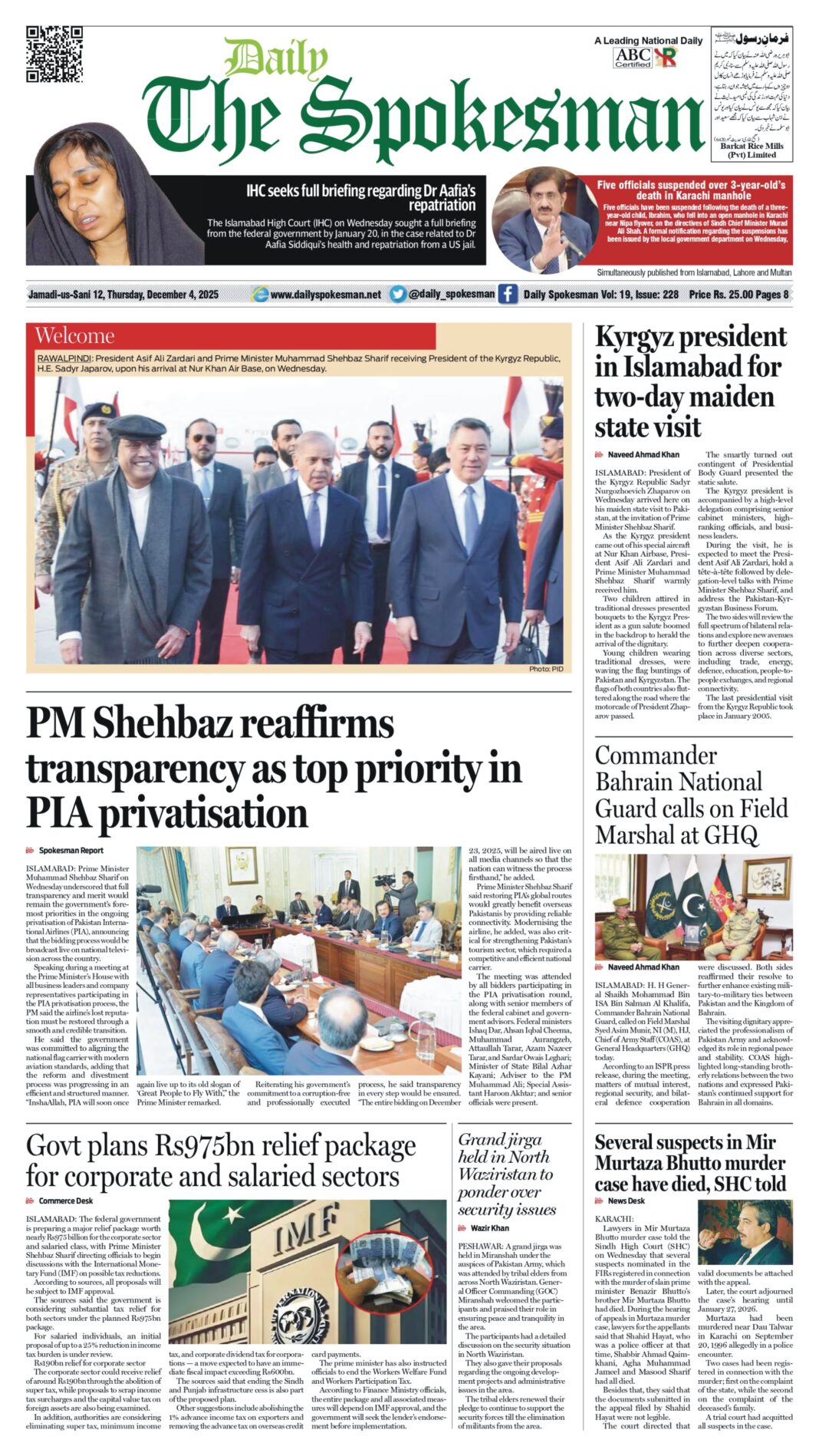 Daily The Spokesman PDF Daily The Spokesman 04 December 2025 PDF By News Desk December 4, 2025 0 57 Share FacebookTwitterPinterestWhatsAppLinkedinEmailTelegram Must read Wasim Aslam Appointed Coordinator to Chairman PMYP for Azad Jammu & Kashmir December 5, 2025 Hope 4 Humanity Gears Up for Pakistan Visit After Productive Meeting with High Commissioner December 4, 2025 Historic Visit: Pakistan and Kyrgyzstan Pen Agreements Across Energy, Mining, and Culture December 4, 2025 Fauji Cement Celebrates Record 5.4 Million Ton Sales at Annual Dealers Event December 3, 2025 News Deskhttps://dailyspokesman.net/live Daily The Spokesman 04 December 2025 PDF TagsDaily The Spokesman 04 December 2025 PDF Share FacebookTwitterPinterestWhatsAppLinkedinEmailTelegram Previous articleFauji Cement Celebrates Record 5.4 Million Ton Sales at Annual Dealers EventNext articleHistoric Visit: Pakistan and Kyrgyzstan Pen Agreements Across Energy, Mining, and Culture - Advertisement - More articles Daily The Spokesman 03 December 2025 PDF December 3, 2025 Daily The Spokesman 02 December 2025 PDF December 2, 2025 Daily The Spokesman 01 December 2025 PDF December 1, 2025 - Advertisement - Latest article Wasim Aslam Appointed Coordinator to Chairman PMYP for Azad Jammu & Kashmir December 5, 2025 Hope 4 Humanity Gears Up for Pakistan Visit After Productive Meeting with High Commissioner December 4, 2025 Historic Visit: Pakistan and Kyrgyzstan Pen Agreements Across Energy, Mining, and Culture December 4, 2025 Fauji Cement Celebrates Record 5.4 Million Ton Sales at Annual Dealers Event December 3, 2025 NLC’s contributions gets recognition at Tashkent December 3, 2025