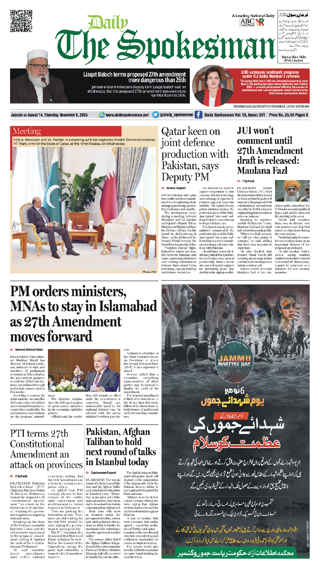 Daily The Spokesman PDF Daily The Spokesman 06 November 2025 PDF By News Desk November 6, 2025 0 55 Share FacebookTwitterPinterestWhatsAppLinkedinEmailTelegram Must read Wasim Aslam Appointed Coordinator to Chairman PMYP for Azad Jammu & Kashmir December 5, 2025 Hope 4 Humanity Gears Up for Pakistan Visit After Productive Meeting with High Commissioner December 4, 2025 Historic Visit: Pakistan and Kyrgyzstan Pen Agreements Across Energy, Mining, and Culture December 4, 2025 Daily The Spokesman 04 December 2025 PDF December 4, 2025 News Deskhttps://dailyspokesman.net/live Daily The Spokesman 06 November 2025 PDF TagsDaily The Spokesman 06 November 2025 PDF Share FacebookTwitterPinterestWhatsAppLinkedinEmailTelegram Previous articleVictory Day ::::::Pakistan-Azerbaijan bonds are Historical and Enduring,Says GilaniNext articleSixth round of peace talks between Pakistan and Afghanistan today - Advertisement - More articles Daily The Spokesman 04 December 2025 PDF December 4, 2025 Daily The Spokesman 03 December 2025 PDF December 3, 2025 Daily The Spokesman 02 December 2025 PDF December 2, 2025 - Advertisement - Latest article Wasim Aslam Appointed Coordinator to Chairman PMYP for Azad Jammu & Kashmir December 5, 2025 Hope 4 Humanity Gears Up for Pakistan Visit After Productive Meeting with High Commissioner December 4, 2025 Historic Visit: Pakistan and Kyrgyzstan Pen Agreements Across Energy, Mining, and Culture December 4, 2025 Daily The Spokesman 04 December 2025 PDF December 4, 2025 Fauji Cement Celebrates Record 5.4 Million Ton Sales at Annual Dealers Event December 3, 2025
