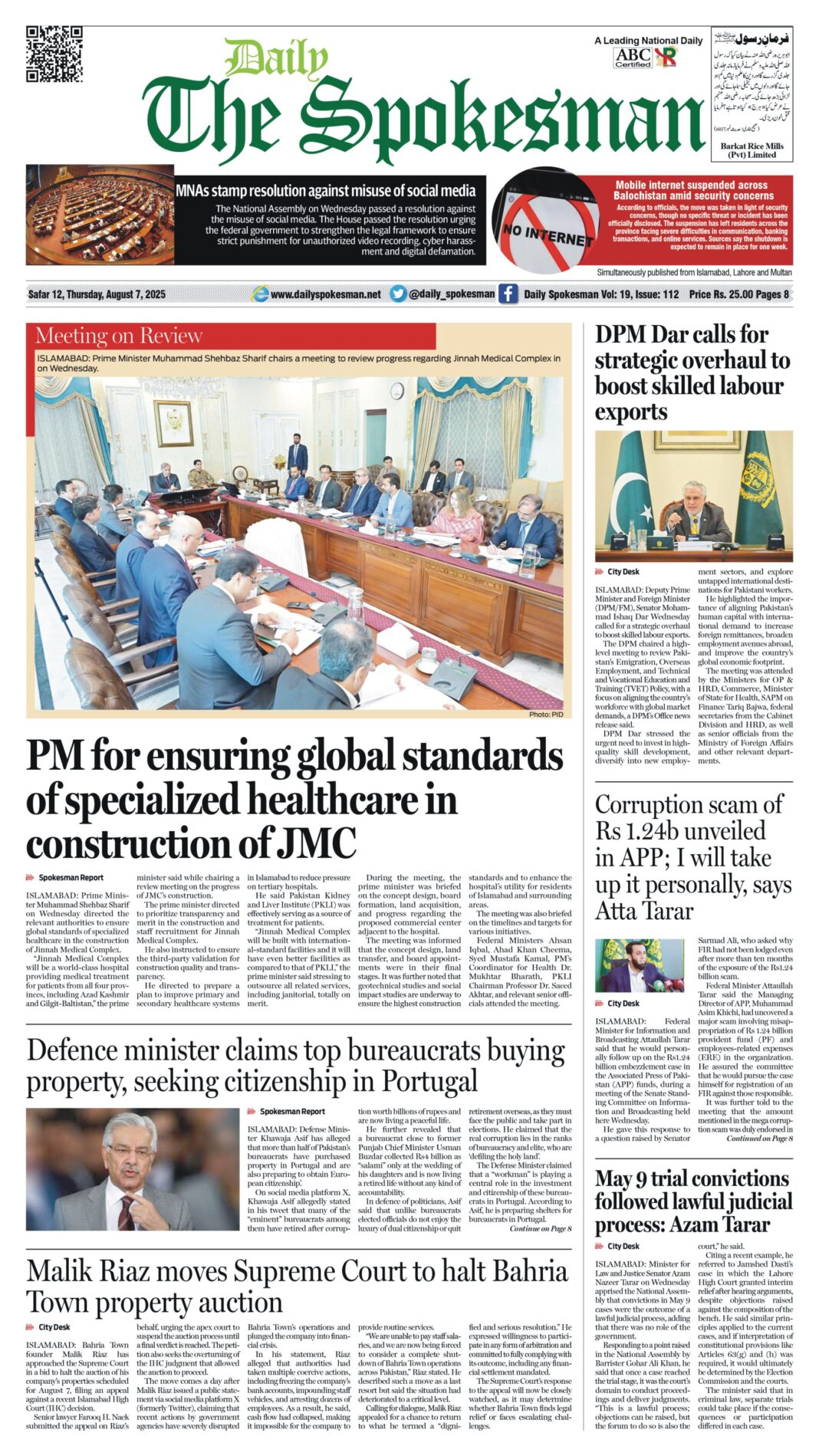 Daily The Spokesman PDF Daily The Spokesman 07 August 2025 PDF By News Desk August 7, 2025 0 511 Share FacebookTwitterPinterestWhatsAppLinkedinEmailTelegram Must read Daily The Spokesman 05 December 2025 PDF December 5, 2025 Wasim Aslam Appointed Coordinator to Chairman PMYP for Azad Jammu & Kashmir December 5, 2025 Hope 4 Humanity Gears Up for Pakistan Visit After Productive Meeting with High Commissioner December 4, 2025 Historic Visit: Pakistan and Kyrgyzstan Pen Agreements Across Energy, Mining, and Culture December 4, 2025 News Deskhttps://dailyspokesman.net/live Daily The Spokesman 07 August 2025 PDF TagsDaily The Spokesman 07 August 2025 PDF Share FacebookTwitterPinterestWhatsAppLinkedinEmailTelegram Previous articleDaily The Spokesman 06 August 2025 PDFNext articlePresident of Turkmenistan Serdar Berdimuhamedov took part in the Third UN Conference on Landlocked Developing Countries - Advertisement - More articles Daily The Spokesman 05 December 2025 PDF December 5, 2025 Daily The Spokesman 04 December 2025 PDF December 4, 2025 Daily The Spokesman 03 December 2025 PDF December 3, 2025 - Advertisement - Latest article Daily The Spokesman 05 December 2025 PDF December 5, 2025 Wasim Aslam Appointed Coordinator to Chairman PMYP for Azad Jammu & Kashmir December 5, 2025 Hope 4 Humanity Gears Up for Pakistan Visit After Productive Meeting with High Commissioner December 4, 2025 Historic Visit: Pakistan and Kyrgyzstan Pen Agreements Across Energy, Mining, and Culture December 4, 2025 Daily The Spokesman 04 December 2025 PDF December 4, 2025