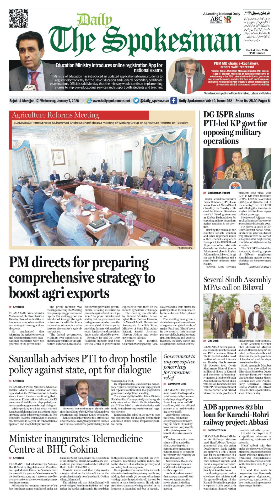 Daily The Spokesman PDF Daily The Spokesman 07 January 2026 PDF By News Desk January 7, 2026 0 44 Share FacebookTwitterPinterestWhatsAppLinkedinEmailTelegram Must read Renowned Pakistani Artist Khalil Najmi Honors Ottawa High Commission with Jinnah Masterpiece January 8, 2026 Daily The Spokesman 08 January 2026 PDF January 8, 2026 Digital Billboard Campaign in Washington Calls on United Nations to Honor Kashmiris’ Right to Self-Determination January 6, 2026 Daily The Spokesman 06 January 2026 PDF January 6, 2026 News Deskhttps://dailyspokesman.net/live Daily The Spokesman 07 January 2026 PDF TagsDaily The Spokesman 07 January 2026 PDFPakistani English newspaperPakistani Newspapers Share FacebookTwitterPinterestWhatsAppLinkedinEmailTelegram Previous articleDigital Billboard Campaign in Washington Calls on United Nations to Honor Kashmiris’ Right to Self-DeterminationNext articleDaily The Spokesman 08 January 2026 PDF - Advertisement - More articles Daily The Spokesman 08 January 2026 PDF January 8, 2026 Daily The Spokesman 06 January 2026 PDF January 6, 2026 Daily The Spokesman 05 January 2026 PDF January 5, 2026 - Advertisement - Latest article Renowned Pakistani Artist Khalil Najmi Honors Ottawa High Commission with Jinnah Masterpiece January 8, 2026 Daily The Spokesman 08 January 2026 PDF January 8, 2026 Digital Billboard Campaign in Washington Calls on United Nations to Honor Kashmiris’ Right to Self-Determination January 6, 2026 Daily The Spokesman 06 January 2026 PDF January 6, 2026 Daily The Spokesman 05 January 2026 PDF January 5, 2026
