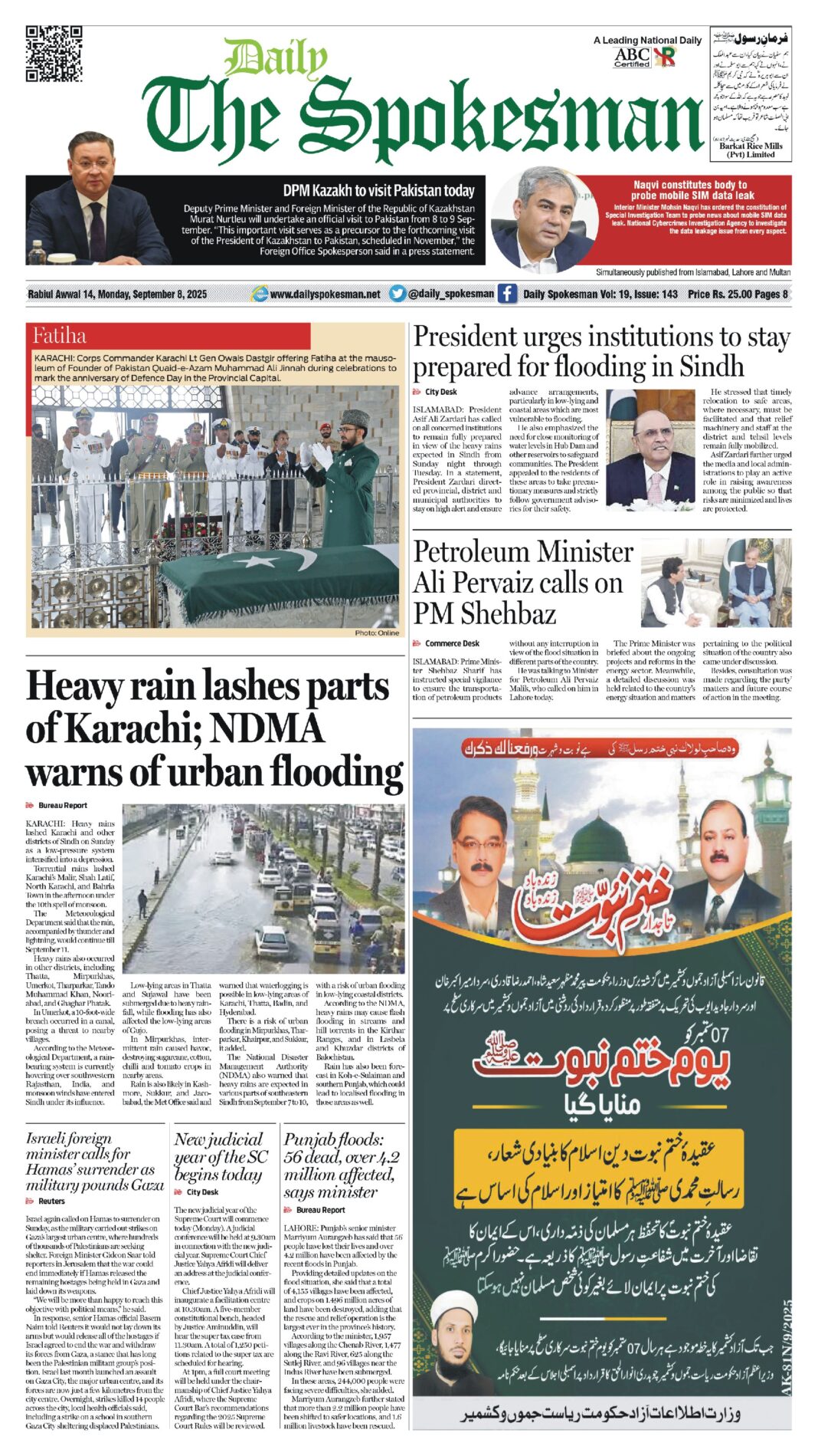Daily The Spokesman PDF Daily The Spokesman 08 September 2025 PDF By News Desk September 8, 2025 0 144 Share FacebookTwitterPinterestWhatsAppLinkedinEmailTelegram Must read Daily The Spokesman 05 December 2025 PDF December 5, 2025 Wasim Aslam Appointed Coordinator to Chairman PMYP for Azad Jammu & Kashmir December 5, 2025 Hope 4 Humanity Gears Up for Pakistan Visit After Productive Meeting with High Commissioner December 4, 2025 Historic Visit: Pakistan and Kyrgyzstan Pen Agreements Across Energy, Mining, and Culture December 4, 2025 News Deskhttps://dailyspokesman.net/live Daily The Spokesman 08 September 2025 PDF TagsDaily The Spokesman 08 September 2025 PDF Share FacebookTwitterPinterestWhatsAppLinkedinEmailTelegram Previous articleStrengthening Digital Ties: Huawei Takes Center Stage in Pakistan-China IT CollaborationNext articleCDC Onboards JS Global Capital Limited to RAAST Aggregator - Advertisement - More articles Daily The Spokesman 05 December 2025 PDF December 5, 2025 Daily The Spokesman 04 December 2025 PDF December 4, 2025 Daily The Spokesman 03 December 2025 PDF December 3, 2025 - Advertisement - Latest article Daily The Spokesman 05 December 2025 PDF December 5, 2025 Wasim Aslam Appointed Coordinator to Chairman PMYP for Azad Jammu & Kashmir December 5, 2025 Hope 4 Humanity Gears Up for Pakistan Visit After Productive Meeting with High Commissioner December 4, 2025 Historic Visit: Pakistan and Kyrgyzstan Pen Agreements Across Energy, Mining, and Culture December 4, 2025 Daily The Spokesman 04 December 2025 PDF December 4, 2025