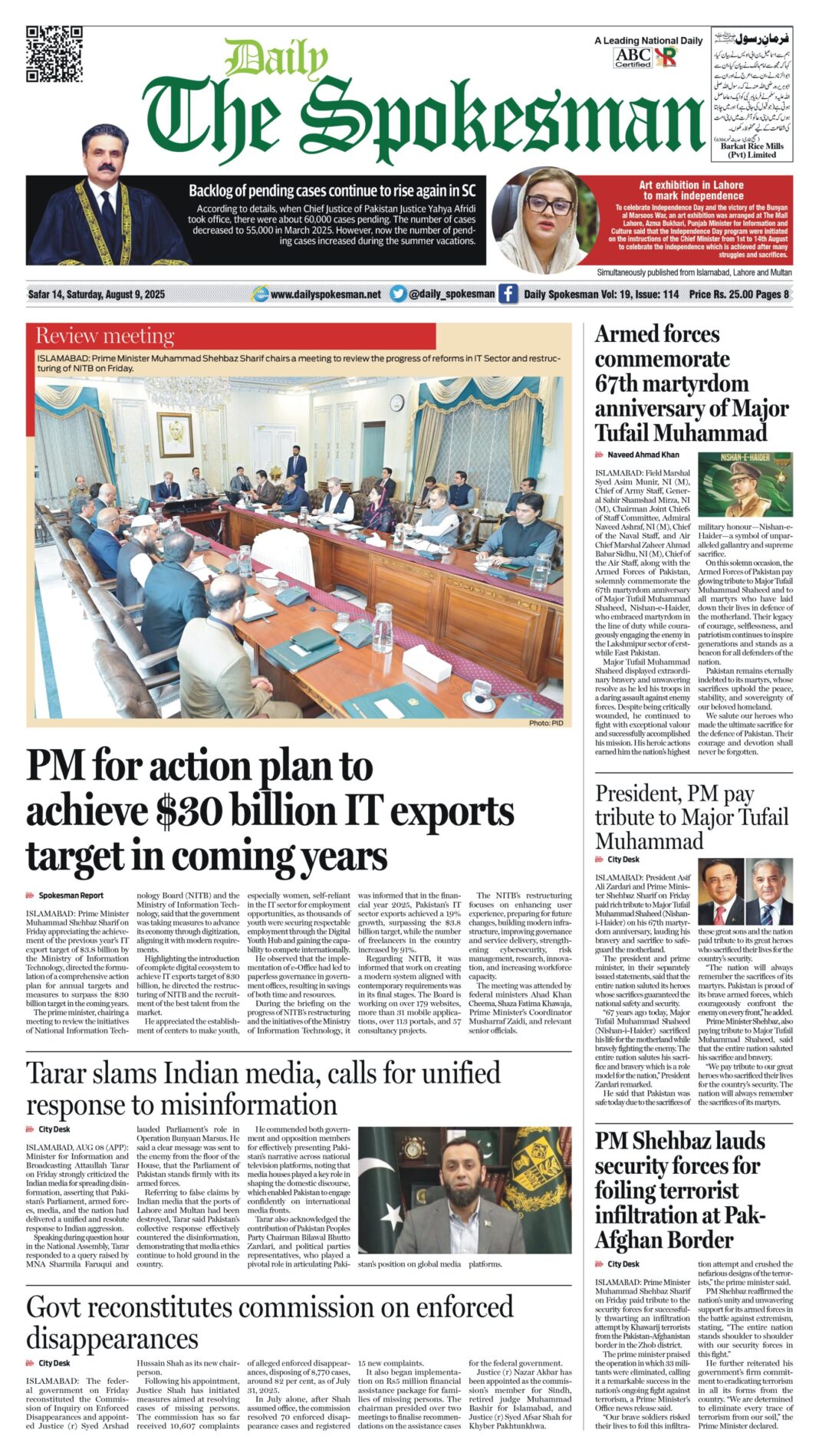 Daily The Spokesman PDF Daily The Spokesman 09 August 2025 PDF By News Desk August 9, 2025 0 532 Share FacebookTwitterPinterestWhatsAppLinkedinEmailTelegram Must read Daily The Spokesman 05 December 2025 PDF December 5, 2025 Wasim Aslam Appointed Coordinator to Chairman PMYP for Azad Jammu & Kashmir December 5, 2025 Hope 4 Humanity Gears Up for Pakistan Visit After Productive Meeting with High Commissioner December 4, 2025 Historic Visit: Pakistan and Kyrgyzstan Pen Agreements Across Energy, Mining, and Culture December 4, 2025 News Deskhttps://dailyspokesman.net/live Daily The Spokesman 09 August 2025 PDF TagsDaily The Spokesman 09 August 2025 PDF Share FacebookTwitterPinterestWhatsAppLinkedinEmailTelegram Previous articleWHO alerted that only 48.4% per cent of infants under six months are exclusively breastfed in PakistanNext articleCMPak’s Network Stands Firm Against Harsh Weather - Advertisement - More articles Daily The Spokesman 05 December 2025 PDF December 5, 2025 Daily The Spokesman 04 December 2025 PDF December 4, 2025 Daily The Spokesman 03 December 2025 PDF December 3, 2025 - Advertisement - Latest article Daily The Spokesman 05 December 2025 PDF December 5, 2025 Wasim Aslam Appointed Coordinator to Chairman PMYP for Azad Jammu & Kashmir December 5, 2025 Hope 4 Humanity Gears Up for Pakistan Visit After Productive Meeting with High Commissioner December 4, 2025 Historic Visit: Pakistan and Kyrgyzstan Pen Agreements Across Energy, Mining, and Culture December 4, 2025 Daily The Spokesman 04 December 2025 PDF December 4, 2025