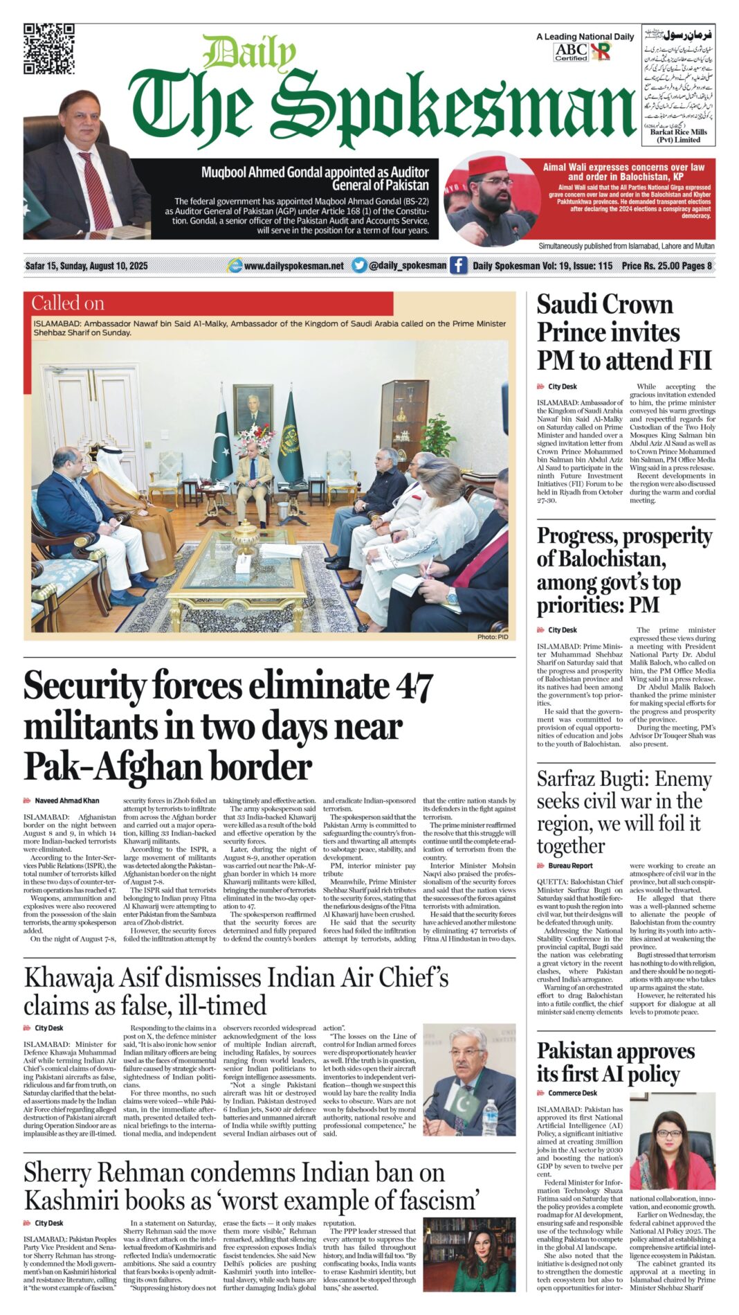 Daily The Spokesman PDF Daily The Spokesman 10 August 2025 PDF By News Desk August 10, 2025 0 692 Share FacebookTwitterPinterestWhatsAppLinkedinEmailTelegram Must read Daily The Spokesman 05 December 2025 PDF December 5, 2025 Wasim Aslam Appointed Coordinator to Chairman PMYP for Azad Jammu & Kashmir December 5, 2025 Hope 4 Humanity Gears Up for Pakistan Visit After Productive Meeting with High Commissioner December 4, 2025 Historic Visit: Pakistan and Kyrgyzstan Pen Agreements Across Energy, Mining, and Culture December 4, 2025 News Deskhttps://dailyspokesman.net/live Daily The Spokesman 10 August 2025 PDF TagsDaily The Spokesman 10 August 2025 PDF Share FacebookTwitterPinterestWhatsAppLinkedinEmailTelegram Previous articleCMPak’s Network Stands Firm Against Harsh Weather Next articleDaily The Spokesman 11 August 2025 PDF - Advertisement - More articles Daily The Spokesman 05 December 2025 PDF December 5, 2025 Daily The Spokesman 04 December 2025 PDF December 4, 2025 Daily The Spokesman 03 December 2025 PDF December 3, 2025 - Advertisement - Latest article Daily The Spokesman 05 December 2025 PDF December 5, 2025 Wasim Aslam Appointed Coordinator to Chairman PMYP for Azad Jammu & Kashmir December 5, 2025 Hope 4 Humanity Gears Up for Pakistan Visit After Productive Meeting with High Commissioner December 4, 2025 Historic Visit: Pakistan and Kyrgyzstan Pen Agreements Across Energy, Mining, and Culture December 4, 2025 Daily The Spokesman 04 December 2025 PDF December 4, 2025