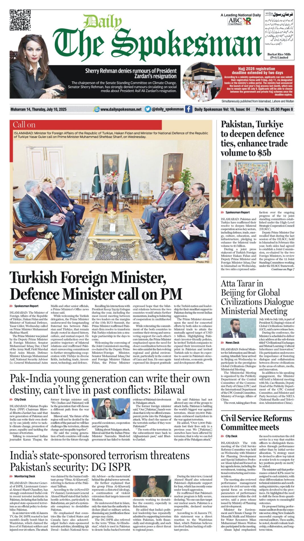 Daily The Spokesman PDF Daily The Spokesman 10 July 2025 PDF By News Desk July 10, 2025 0 443 Share FacebookTwitterPinterestWhatsAppLinkedinEmailTelegram Must read Daily The Spokesman 05 December 2025 PDF December 5, 2025 Wasim Aslam Appointed Coordinator to Chairman PMYP for Azad Jammu & Kashmir December 5, 2025 Hope 4 Humanity Gears Up for Pakistan Visit After Productive Meeting with High Commissioner December 4, 2025 Historic Visit: Pakistan and Kyrgyzstan Pen Agreements Across Energy, Mining, and Culture December 4, 2025 News Deskhttps://dailyspokesman.net/live Daily The Spokesman 10 July 2025 PDF TagsDaily The Spokesman 10 July 2025 PDF Share FacebookTwitterPinterestWhatsAppLinkedinEmailTelegram Previous articleWHO, Pakistan and partners prepare health emergency response for 1.3 million people ahead of monsoon floodsNext articleDaily The Spokesman 11 July 2025 PDF - Advertisement - More articles Daily The Spokesman 05 December 2025 PDF December 5, 2025 Daily The Spokesman 04 December 2025 PDF December 4, 2025 Daily The Spokesman 03 December 2025 PDF December 3, 2025 - Advertisement - Latest article Daily The Spokesman 05 December 2025 PDF December 5, 2025 Wasim Aslam Appointed Coordinator to Chairman PMYP for Azad Jammu & Kashmir December 5, 2025 Hope 4 Humanity Gears Up for Pakistan Visit After Productive Meeting with High Commissioner December 4, 2025 Historic Visit: Pakistan and Kyrgyzstan Pen Agreements Across Energy, Mining, and Culture December 4, 2025 Daily The Spokesman 04 December 2025 PDF December 4, 2025