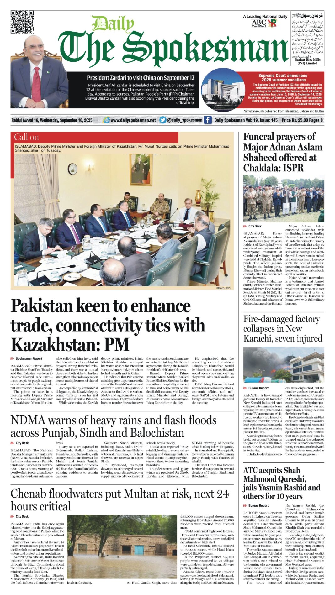 Daily The Spokesman PDF Daily The Spokesman 10 September 2025 PDF By News Desk September 10, 2025 0 99 Share FacebookTwitterPinterestWhatsAppLinkedinEmailTelegram Must read Daily The Spokesman 05 December 2025 PDF December 5, 2025 Wasim Aslam Appointed Coordinator to Chairman PMYP for Azad Jammu & Kashmir December 5, 2025 Hope 4 Humanity Gears Up for Pakistan Visit After Productive Meeting with High Commissioner December 4, 2025 Historic Visit: Pakistan and Kyrgyzstan Pen Agreements Across Energy, Mining, and Culture December 4, 2025 News Deskhttps://dailyspokesman.net/live Daily The Spokesman 10 September 2025 PDF TagsDaily The Spokesman 10 September 2025 PDF Share FacebookTwitterPinterestWhatsAppLinkedinEmailTelegram Previous articleIsrael attacked on Qatar DohaNext articleDaily The Spokesman 11 September 2025 PDF - Advertisement - More articles Daily The Spokesman 05 December 2025 PDF December 5, 2025 Daily The Spokesman 04 December 2025 PDF December 4, 2025 Daily The Spokesman 03 December 2025 PDF December 3, 2025 - Advertisement - Latest article Daily The Spokesman 05 December 2025 PDF December 5, 2025 Wasim Aslam Appointed Coordinator to Chairman PMYP for Azad Jammu & Kashmir December 5, 2025 Hope 4 Humanity Gears Up for Pakistan Visit After Productive Meeting with High Commissioner December 4, 2025 Historic Visit: Pakistan and Kyrgyzstan Pen Agreements Across Energy, Mining, and Culture December 4, 2025 Daily The Spokesman 04 December 2025 PDF December 4, 2025