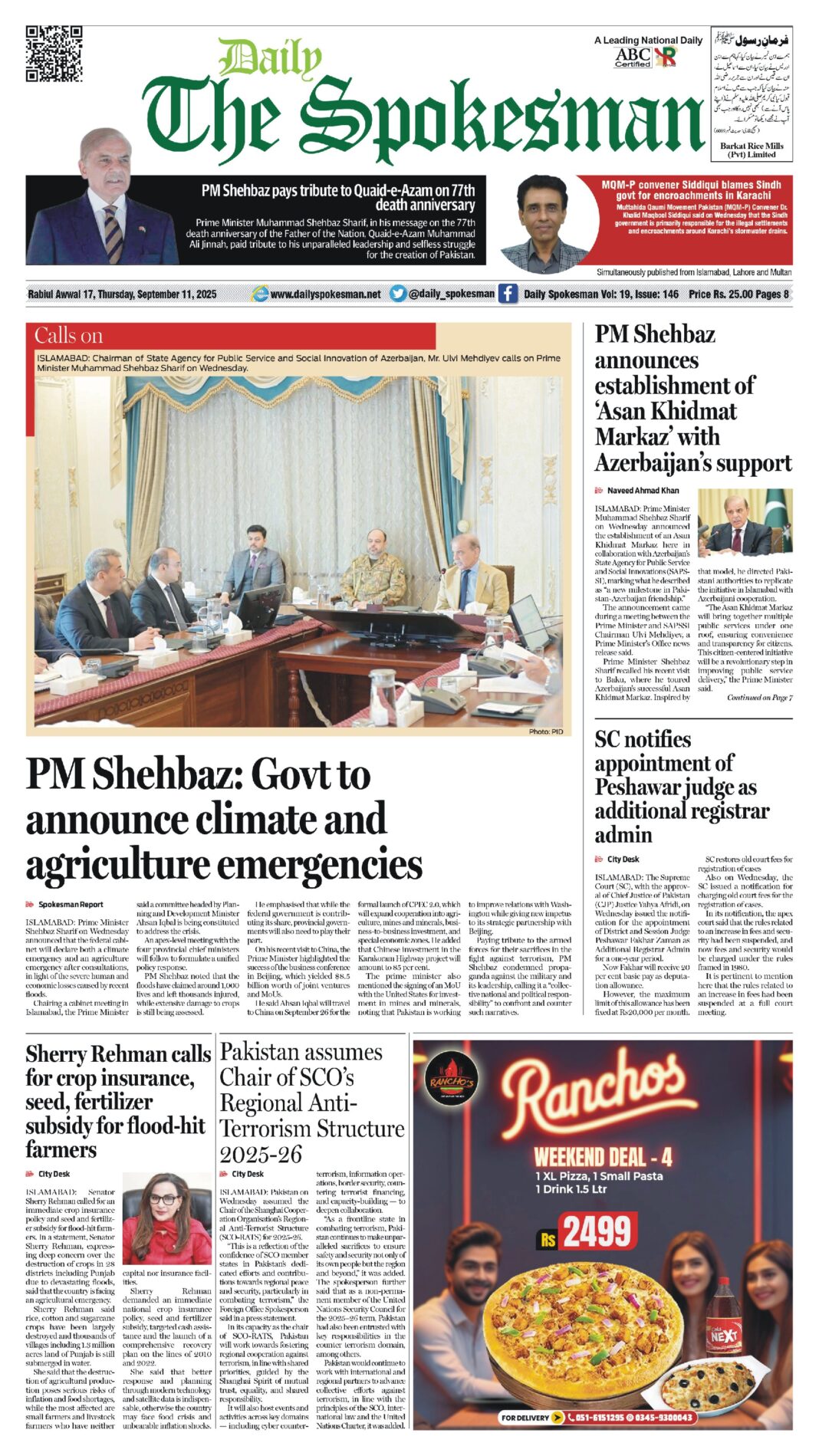 Daily The Spokesman PDF Daily The Spokesman 11 September 2025 PDF By News Desk September 11, 2025 0 109 Share FacebookTwitterPinterestWhatsAppLinkedinEmailTelegram Must read Daily The Spokesman 05 December 2025 PDF December 5, 2025 Wasim Aslam Appointed Coordinator to Chairman PMYP for Azad Jammu & Kashmir December 5, 2025 Hope 4 Humanity Gears Up for Pakistan Visit After Productive Meeting with High Commissioner December 4, 2025 Historic Visit: Pakistan and Kyrgyzstan Pen Agreements Across Energy, Mining, and Culture December 4, 2025 News Deskhttps://dailyspokesman.net/live Daily The Spokesman 11 September 2025 PDF TagsDaily The Spokesman 11 September 2025 PDF Share FacebookTwitterPinterestWhatsAppLinkedinEmailTelegram Previous articleDaily The Spokesman 10 September 2025 PDFNext articleXinhua think tank report exposes perils of U.S. ideological colonization - Advertisement - More articles Daily The Spokesman 05 December 2025 PDF December 5, 2025 Daily The Spokesman 04 December 2025 PDF December 4, 2025 Daily The Spokesman 03 December 2025 PDF December 3, 2025 - Advertisement - Latest article Daily The Spokesman 05 December 2025 PDF December 5, 2025 Wasim Aslam Appointed Coordinator to Chairman PMYP for Azad Jammu & Kashmir December 5, 2025 Hope 4 Humanity Gears Up for Pakistan Visit After Productive Meeting with High Commissioner December 4, 2025 Historic Visit: Pakistan and Kyrgyzstan Pen Agreements Across Energy, Mining, and Culture December 4, 2025 Daily The Spokesman 04 December 2025 PDF December 4, 2025