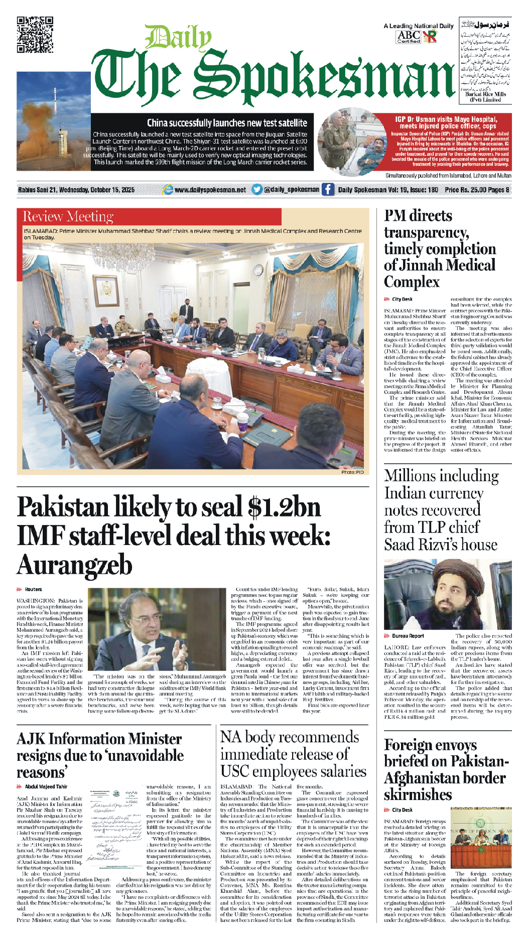 Daily The Spokesman PDF Daily The Spokesman 15 October 2025 PDF By News Desk October 15, 2025 0 102 Share FacebookTwitterPinterestWhatsAppLinkedinEmailTelegram Must read Daily The Spokesman 05 December 2025 PDF December 5, 2025 Wasim Aslam Appointed Coordinator to Chairman PMYP for Azad Jammu & Kashmir December 5, 2025 Hope 4 Humanity Gears Up for Pakistan Visit After Productive Meeting with High Commissioner December 4, 2025 Historic Visit: Pakistan and Kyrgyzstan Pen Agreements Across Energy, Mining, and Culture December 4, 2025 News Deskhttps://dailyspokesman.net/live Daily The Spokesman 15 October 2025 PDF TagsDaily The Spokesman 15 October 2025 PDF Share FacebookTwitterPinterestWhatsAppLinkedinEmailTelegram Previous articleDaily The Spokesman 14 October 2025 PDFNext articleUN Women, FAO, and KP Government Promote Women’s Leadership in Agriculture - Advertisement - More articles Daily The Spokesman 05 December 2025 PDF December 5, 2025 Daily The Spokesman 04 December 2025 PDF December 4, 2025 Daily The Spokesman 03 December 2025 PDF December 3, 2025 - Advertisement - Latest article Daily The Spokesman 05 December 2025 PDF December 5, 2025 Wasim Aslam Appointed Coordinator to Chairman PMYP for Azad Jammu & Kashmir December 5, 2025 Hope 4 Humanity Gears Up for Pakistan Visit After Productive Meeting with High Commissioner December 4, 2025 Historic Visit: Pakistan and Kyrgyzstan Pen Agreements Across Energy, Mining, and Culture December 4, 2025 Daily The Spokesman 04 December 2025 PDF December 4, 2025