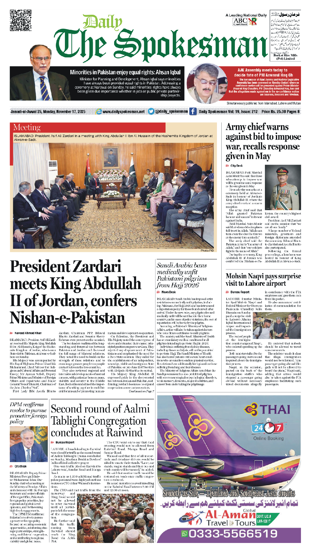 Daily The Spokesman PDF Daily The Spokesman 17 November 2025 PDF By News Desk November 17, 2025 0 37 Share FacebookTwitterPinterestWhatsAppLinkedinEmailTelegram Must read Wasim Aslam Appointed Coordinator to Chairman PMYP for Azad Jammu & Kashmir December 5, 2025 Hope 4 Humanity Gears Up for Pakistan Visit After Productive Meeting with High Commissioner December 4, 2025 Historic Visit: Pakistan and Kyrgyzstan Pen Agreements Across Energy, Mining, and Culture December 4, 2025 Daily The Spokesman 04 December 2025 PDF December 4, 2025 News Deskhttps://dailyspokesman.net/live Daily The Spokesman 17 November 2025 PDF TagsDaily The Spokesman 17 November 2025 PDF Share FacebookTwitterPinterestWhatsAppLinkedinEmailTelegram Previous articleField Marshal warns against bid to impose war, recalls response given in MayNext articleThe President of Uzbekistan outlines priority areas for practical regional cooperation within the new format - Advertisement - More articles Daily The Spokesman 04 December 2025 PDF December 4, 2025 Daily The Spokesman 03 December 2025 PDF December 3, 2025 Daily The Spokesman 02 December 2025 PDF December 2, 2025 - Advertisement - Latest article Wasim Aslam Appointed Coordinator to Chairman PMYP for Azad Jammu & Kashmir December 5, 2025 Hope 4 Humanity Gears Up for Pakistan Visit After Productive Meeting with High Commissioner December 4, 2025 Historic Visit: Pakistan and Kyrgyzstan Pen Agreements Across Energy, Mining, and Culture December 4, 2025 Daily The Spokesman 04 December 2025 PDF December 4, 2025 Fauji Cement Celebrates Record 5.4 Million Ton Sales at Annual Dealers Event December 3, 2025