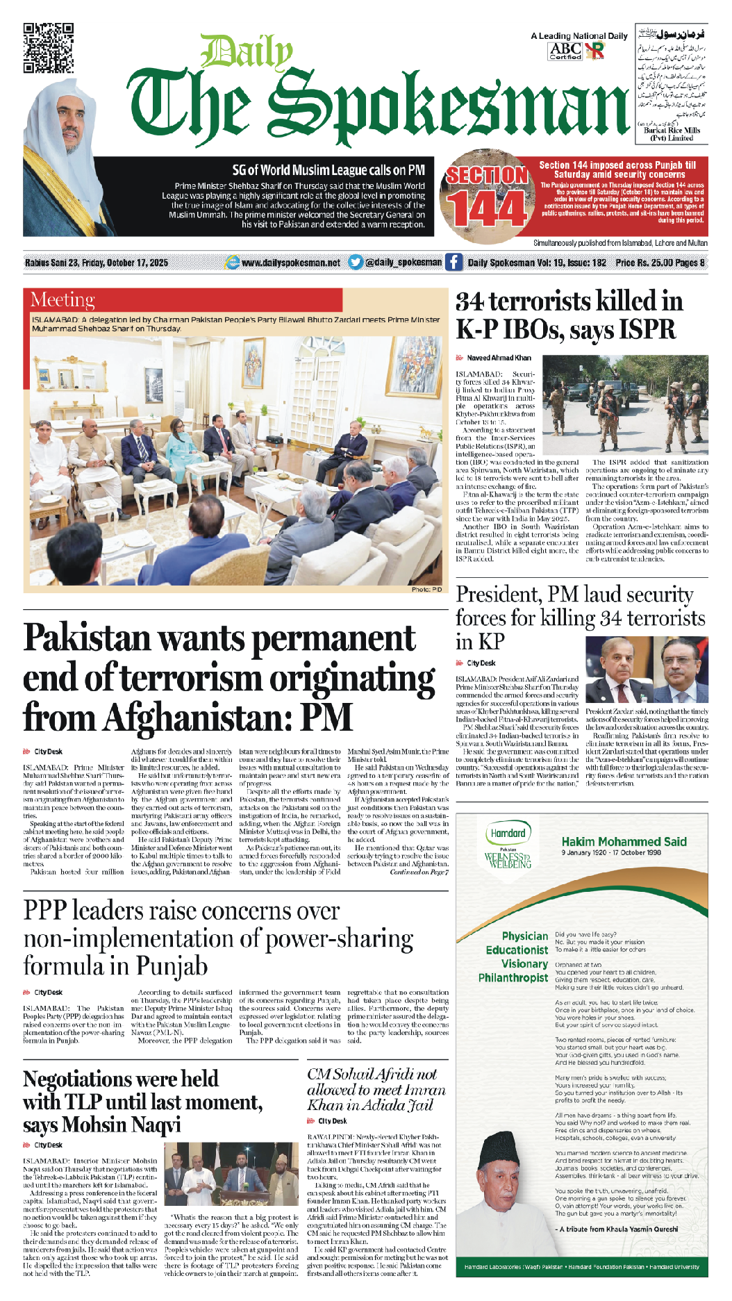 Daily The Spokesman PDF Daily The Spokesman 17 October 2025 PDF By News Desk October 17, 2025 0 82 Share FacebookTwitterPinterestWhatsAppLinkedinEmailTelegram Must read Daily The Spokesman 05 December 2025 PDF December 5, 2025 Wasim Aslam Appointed Coordinator to Chairman PMYP for Azad Jammu & Kashmir December 5, 2025 Hope 4 Humanity Gears Up for Pakistan Visit After Productive Meeting with High Commissioner December 4, 2025 Historic Visit: Pakistan and Kyrgyzstan Pen Agreements Across Energy, Mining, and Culture December 4, 2025 News Deskhttps://dailyspokesman.net/live Daily The Spokesman 17 October 2025 PDF TagsDaily The Spokesman 17 October 2025 PDF Share FacebookTwitterPinterestWhatsAppLinkedinEmailTelegram Previous articleMisinformation Embarrasses Petroleum Division: Inquiry Launched into Conflicting Statements on Cnergyico DebtNext articleDaily The Spokesman 18 October 2025 PDF - Advertisement - More articles Daily The Spokesman 05 December 2025 PDF December 5, 2025 Daily The Spokesman 04 December 2025 PDF December 4, 2025 Daily The Spokesman 03 December 2025 PDF December 3, 2025 - Advertisement - Latest article Daily The Spokesman 05 December 2025 PDF December 5, 2025 Wasim Aslam Appointed Coordinator to Chairman PMYP for Azad Jammu & Kashmir December 5, 2025 Hope 4 Humanity Gears Up for Pakistan Visit After Productive Meeting with High Commissioner December 4, 2025 Historic Visit: Pakistan and Kyrgyzstan Pen Agreements Across Energy, Mining, and Culture December 4, 2025 Daily The Spokesman 04 December 2025 PDF December 4, 2025