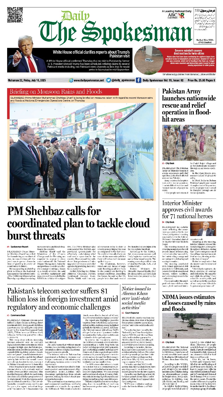 Daily The Spokesman PDF Daily The Spokesman 18 July 2025 PDF By News Desk July 18, 2025 0 432 Share FacebookTwitterPinterestWhatsAppLinkedinEmailTelegram Must read Daily The Spokesman 05 December 2025 PDF December 5, 2025 Wasim Aslam Appointed Coordinator to Chairman PMYP for Azad Jammu & Kashmir December 5, 2025 Hope 4 Humanity Gears Up for Pakistan Visit After Productive Meeting with High Commissioner December 4, 2025 Historic Visit: Pakistan and Kyrgyzstan Pen Agreements Across Energy, Mining, and Culture December 4, 2025 News Deskhttps://dailyspokesman.net/live Daily The Spokesman 18 July 2025 PDF TagsDaily The Spokesman 18 July 2025 PDF Share FacebookTwitterPinterestWhatsAppLinkedinEmailTelegram Previous articleKOICA’s Support, UN Women Launches Digital Startup Roundtable to Uplift Young Women in TechNext article“A New Era of Warfare: Experts Converge on AI, Cyber Warfare, and Unmanned Aerial Systems” - Advertisement - More articles Daily The Spokesman 05 December 2025 PDF December 5, 2025 Daily The Spokesman 04 December 2025 PDF December 4, 2025 Daily The Spokesman 03 December 2025 PDF December 3, 2025 - Advertisement - Latest article Daily The Spokesman 05 December 2025 PDF December 5, 2025 Wasim Aslam Appointed Coordinator to Chairman PMYP for Azad Jammu & Kashmir December 5, 2025 Hope 4 Humanity Gears Up for Pakistan Visit After Productive Meeting with High Commissioner December 4, 2025 Historic Visit: Pakistan and Kyrgyzstan Pen Agreements Across Energy, Mining, and Culture December 4, 2025 Daily The Spokesman 04 December 2025 PDF December 4, 2025