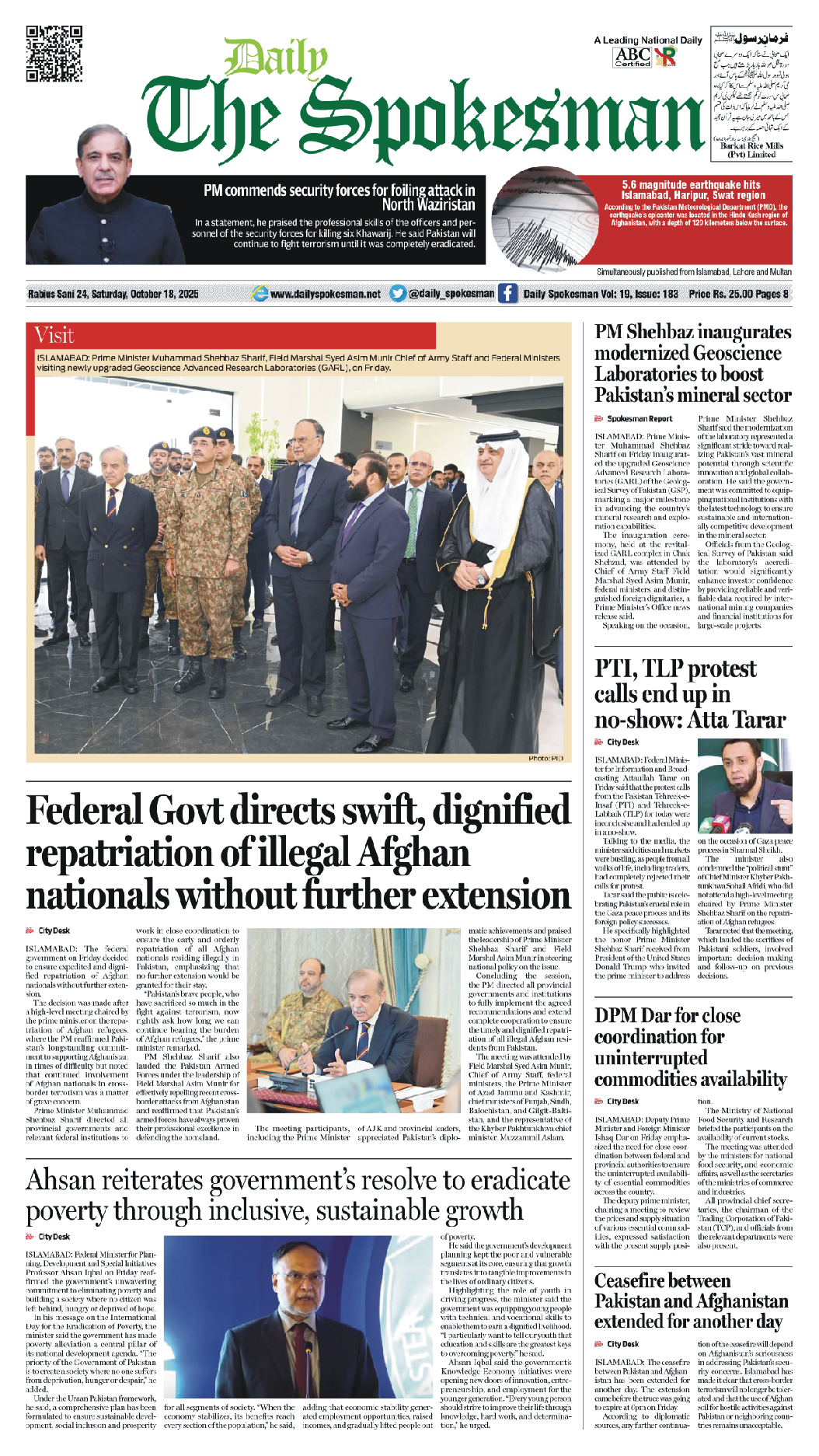 Daily The Spokesman PDF Daily The Spokesman 18 October 2025 PDF By News Desk October 18, 2025 0 90 Share FacebookTwitterPinterestWhatsAppLinkedinEmailTelegram Must read Daily The Spokesman 05 December 2025 PDF December 5, 2025 Wasim Aslam Appointed Coordinator to Chairman PMYP for Azad Jammu & Kashmir December 5, 2025 Hope 4 Humanity Gears Up for Pakistan Visit After Productive Meeting with High Commissioner December 4, 2025 Historic Visit: Pakistan and Kyrgyzstan Pen Agreements Across Energy, Mining, and Culture December 4, 2025 News Deskhttps://dailyspokesman.net/live Daily The Spokesman 18 October 2025 PDF TagsDaily The Spokesman 18 October 2025 PDF Share FacebookTwitterPinterestWhatsAppLinkedinEmailTelegram Previous articleDaily The Spokesman 17 October 2025 PDFNext articleDaily The Spokesman 19 October 2025 PDF - Advertisement - More articles Daily The Spokesman 05 December 2025 PDF December 5, 2025 Daily The Spokesman 04 December 2025 PDF December 4, 2025 Daily The Spokesman 03 December 2025 PDF December 3, 2025 - Advertisement - Latest article Daily The Spokesman 05 December 2025 PDF December 5, 2025 Wasim Aslam Appointed Coordinator to Chairman PMYP for Azad Jammu & Kashmir December 5, 2025 Hope 4 Humanity Gears Up for Pakistan Visit After Productive Meeting with High Commissioner December 4, 2025 Historic Visit: Pakistan and Kyrgyzstan Pen Agreements Across Energy, Mining, and Culture December 4, 2025 Daily The Spokesman 04 December 2025 PDF December 4, 2025