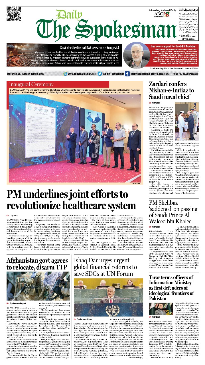 Daily The Spokesman PDF Daily The Spokesman 22 July 2025 PDF By News Desk July 22, 2025 0 467 Share FacebookTwitterPinterestWhatsAppLinkedinEmailTelegram Must read Daily The Spokesman 05 December 2025 PDF December 5, 2025 Wasim Aslam Appointed Coordinator to Chairman PMYP for Azad Jammu & Kashmir December 5, 2025 Hope 4 Humanity Gears Up for Pakistan Visit After Productive Meeting with High Commissioner December 4, 2025 Historic Visit: Pakistan and Kyrgyzstan Pen Agreements Across Energy, Mining, and Culture December 4, 2025 News Deskhttps://dailyspokesman.net/live Daily The Spokesman 22 July 2025 PDF TagsDaily The Spokesman 22 July 2025 PDF Share FacebookTwitterPinterestWhatsAppLinkedinEmailTelegram Previous articleHashoo Group and Global Business Bridge Sign Master Franchise AgreementNext articleEvolving Role:Â Chief Information Security Officers (CISOs) in Combating Cyber Threats - Advertisement - More articles Daily The Spokesman 05 December 2025 PDF December 5, 2025 Daily The Spokesman 04 December 2025 PDF December 4, 2025 Daily The Spokesman 03 December 2025 PDF December 3, 2025 - Advertisement - Latest article Daily The Spokesman 05 December 2025 PDF December 5, 2025 Wasim Aslam Appointed Coordinator to Chairman PMYP for Azad Jammu & Kashmir December 5, 2025 Hope 4 Humanity Gears Up for Pakistan Visit After Productive Meeting with High Commissioner December 4, 2025 Historic Visit: Pakistan and Kyrgyzstan Pen Agreements Across Energy, Mining, and Culture December 4, 2025 Daily The Spokesman 04 December 2025 PDF December 4, 2025