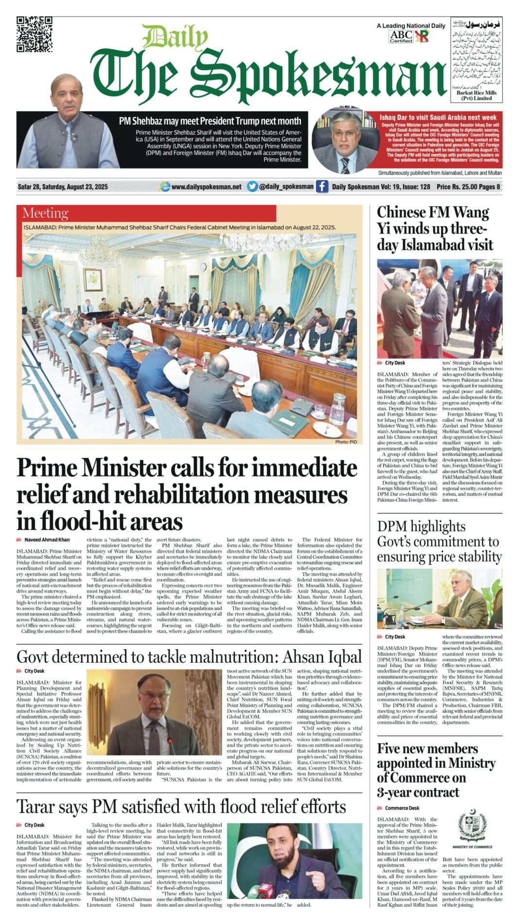 Daily The Spokesman PDF Daily The Spokesman 23 August 2025 PDF By News Desk August 23, 2025 0 585 Share FacebookTwitterPinterestWhatsAppLinkedinEmailTelegram Must read Daily The Spokesman 05 December 2025 PDF December 5, 2025 Wasim Aslam Appointed Coordinator to Chairman PMYP for Azad Jammu & Kashmir December 5, 2025 Hope 4 Humanity Gears Up for Pakistan Visit After Productive Meeting with High Commissioner December 4, 2025 Historic Visit: Pakistan and Kyrgyzstan Pen Agreements Across Energy, Mining, and Culture December 4, 2025 News Deskhttps://dailyspokesman.net/live Daily The Spokesman 23 August 2025 PDF TagsDaily The Spokesman 23 August 2025 PDF Share FacebookTwitterPinterestWhatsAppLinkedinEmailTelegram Previous articleMulti-billion rupee scandal rocks SECPNext articleEnvoys of five countries present credentials to President Asif Ali Zardari - Advertisement - More articles Daily The Spokesman 05 December 2025 PDF December 5, 2025 Daily The Spokesman 04 December 2025 PDF December 4, 2025 Daily The Spokesman 03 December 2025 PDF December 3, 2025 - Advertisement - Latest article Daily The Spokesman 05 December 2025 PDF December 5, 2025 Wasim Aslam Appointed Coordinator to Chairman PMYP for Azad Jammu & Kashmir December 5, 2025 Hope 4 Humanity Gears Up for Pakistan Visit After Productive Meeting with High Commissioner December 4, 2025 Historic Visit: Pakistan and Kyrgyzstan Pen Agreements Across Energy, Mining, and Culture December 4, 2025 Daily The Spokesman 04 December 2025 PDF December 4, 2025