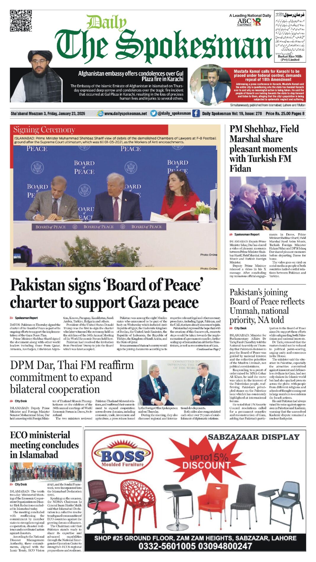 Daily The Spokesman PDF Daily The Spokesman 23 January 2026 PDF By News Desk January 23, 2026 0 25 Share FacebookTwitterPinterestWhatsAppLinkedinEmailTelegram Must read Pakistan signs ‘Board of Peace’ charter to support Gaza peace January 23, 2026 The Hollow Case for “Genocide” and the Dangerous Drive for Partition: How New Delhi Is Balkanising Kashmir January 23, 2026 Tariff Wars and Territorial Fantasies: How Economic Coercion Is Replacing American Diplomacy January 23, 2026 Trump’s Bid for Greenland at Davos January 23, 2026 News Deskhttps://dailyspokesman.net/live Daily The Spokesman 23 January 2026 PDF TagsDaily The Spokesman 23 January 2026 PDF Share FacebookTwitterPinterestWhatsAppLinkedinEmailTelegram Previous articleJanuary: A Month of Tragedy for KashmirNext articleTrump’s Bid for Greenland at Davos - Advertisement - More articles Daily The Spokesman 22 January 2026 PDF January 22, 2026 Daily The Spokesman 21 January 2026 PDF January 21, 2026 Daily The Spokesman 20 January 2026 PDF January 20, 2026 - Advertisement - Latest article Pakistan signs ‘Board of Peace’ charter to support Gaza peace January 23, 2026 The Hollow Case for “Genocide” and the Dangerous Drive for Partition: How New Delhi Is Balkanising Kashmir January 23, 2026 Tariff Wars and Territorial Fantasies: How Economic Coercion Is Replacing American Diplomacy January 23, 2026 Trump’s Bid for Greenland at Davos January 23, 2026 January: A Month of Tragedy for Kashmir January 22, 2026