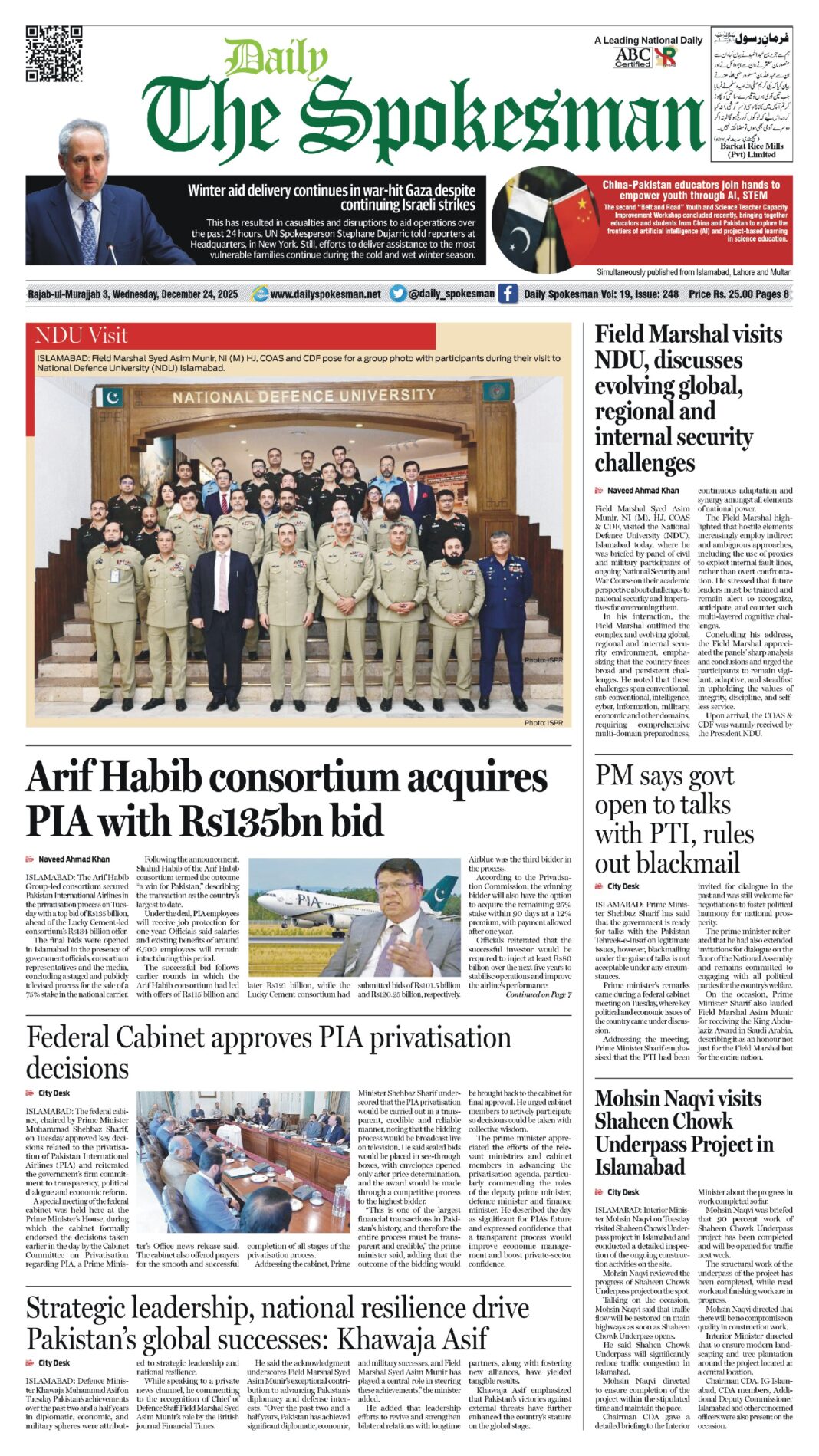 Daily The Spokesman PDF Daily The Spokesman 24 December 2025 PDF By News Desk December 24, 2025 0 153 Share FacebookTwitterPinterestWhatsAppLinkedinEmailTelegram Must read Daily The Spokesman 07 January 2026 PDF January 7, 2026 Digital Billboard Campaign in Washington Calls on United Nations to Honor Kashmiris’ Right to Self-Determination January 6, 2026 Daily The Spokesman 06 January 2026 PDF January 6, 2026 Daily The Spokesman 05 January 2026 PDF January 5, 2026 News Deskhttps://dailyspokesman.net/live Daily The Spokesman 24 December 2025 PDF TagsDaily The Spokesman 24 December 2025 PDF Share FacebookTwitterPinterestWhatsAppLinkedinEmailTelegram Previous articleRussia-Pakistan Relations Poised for Growth After Islamabad RoundtableNext articleCleft Hospital & The Spokesman highlight inclusive healthcare in Pakistan - Advertisement - More articles Daily The Spokesman 07 January 2026 PDF January 7, 2026 Daily The Spokesman 06 January 2026 PDF January 6, 2026 Daily The Spokesman 05 January 2026 PDF January 5, 2026 - Advertisement - Latest article Daily The Spokesman 07 January 2026 PDF January 7, 2026 Digital Billboard Campaign in Washington Calls on United Nations to Honor Kashmiris’ Right to Self-Determination January 6, 2026 Daily The Spokesman 06 January 2026 PDF January 6, 2026 Daily The Spokesman 05 January 2026 PDF January 5, 2026 Ambassador Sohail Mahmood assumes charge of Secretary General of D-8 January 4, 2026