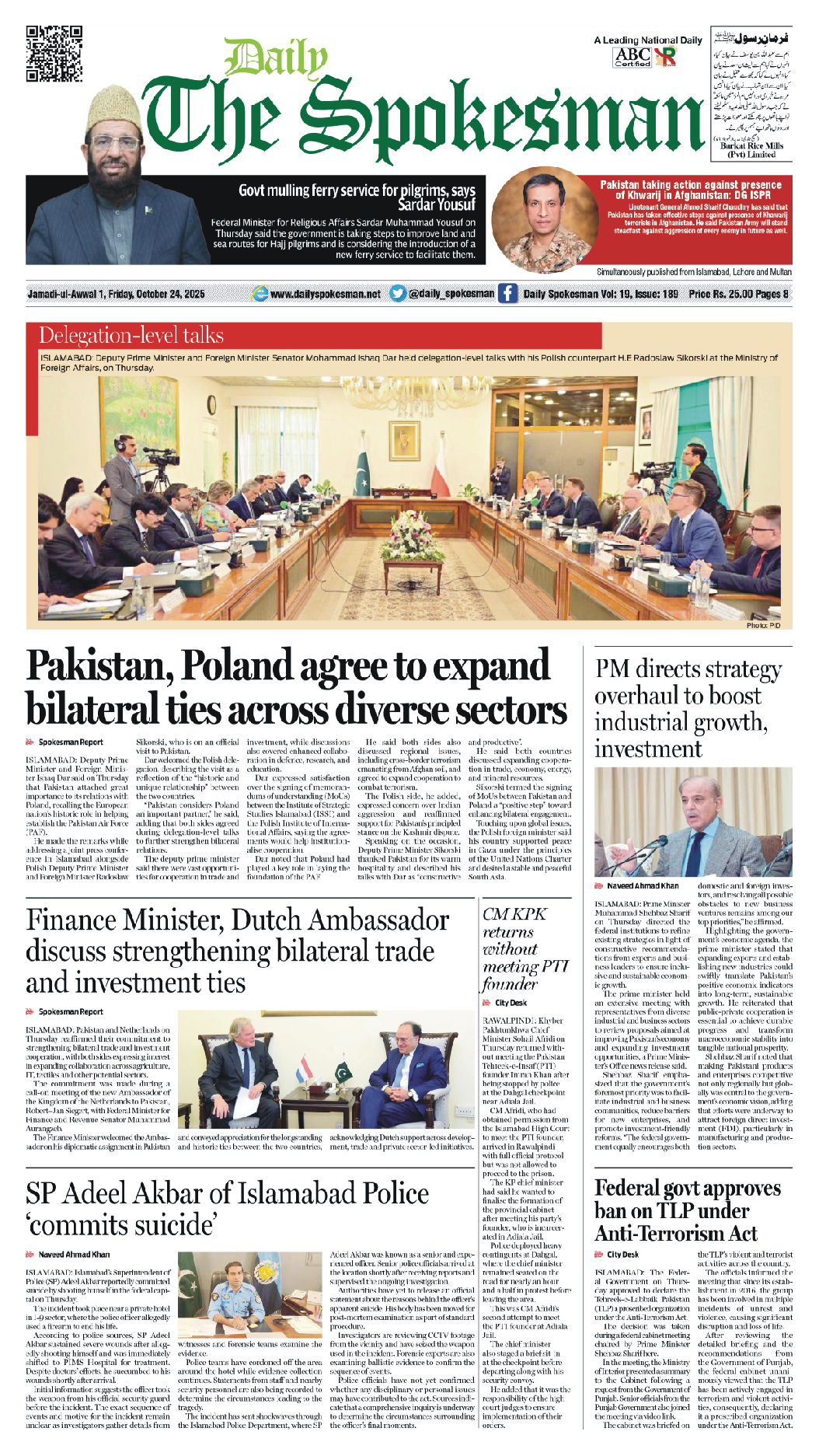 Daily The Spokesman PDF Daily The Spokesman 24 October 2025 PDF By News Desk October 24, 2025 0 80 Share FacebookTwitterPinterestWhatsAppLinkedinEmailTelegram Must read Daily The Spokesman 05 December 2025 PDF December 5, 2025 Wasim Aslam Appointed Coordinator to Chairman PMYP for Azad Jammu & Kashmir December 5, 2025 Hope 4 Humanity Gears Up for Pakistan Visit After Productive Meeting with High Commissioner December 4, 2025 Historic Visit: Pakistan and Kyrgyzstan Pen Agreements Across Energy, Mining, and Culture December 4, 2025 News Deskhttps://dailyspokesman.net/live Daily The Spokesman 24 October 2025 PDF TagsDaily The Spokesman 24 October 2025 PDF Share FacebookTwitterPinterestWhatsAppLinkedinEmailTelegram Previous articleDaily The Spokesman 23 October 2025 PDFNext articleDaily The Spokesman 25 October 2025 PDF - Advertisement - More articles Daily The Spokesman 05 December 2025 PDF December 5, 2025 Daily The Spokesman 04 December 2025 PDF December 4, 2025 Daily The Spokesman 03 December 2025 PDF December 3, 2025 - Advertisement - Latest article Daily The Spokesman 05 December 2025 PDF December 5, 2025 Wasim Aslam Appointed Coordinator to Chairman PMYP for Azad Jammu & Kashmir December 5, 2025 Hope 4 Humanity Gears Up for Pakistan Visit After Productive Meeting with High Commissioner December 4, 2025 Historic Visit: Pakistan and Kyrgyzstan Pen Agreements Across Energy, Mining, and Culture December 4, 2025 Daily The Spokesman 04 December 2025 PDF December 4, 2025