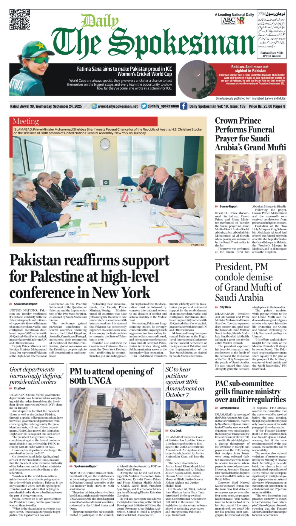 Daily The Spokesman PDF Daily The Spokesman 24 September 2025 PDF By News Desk September 24, 2025 0 109 Share FacebookTwitterPinterestWhatsAppLinkedinEmailTelegram Must read Daily The Spokesman 05 December 2025 PDF December 5, 2025 Wasim Aslam Appointed Coordinator to Chairman PMYP for Azad Jammu & Kashmir December 5, 2025 Hope 4 Humanity Gears Up for Pakistan Visit After Productive Meeting with High Commissioner December 4, 2025 Historic Visit: Pakistan and Kyrgyzstan Pen Agreements Across Energy, Mining, and Culture December 4, 2025 News Deskhttps://dailyspokesman.net/live Daily The Spokesman 24 September 2025 PDF TagsDaily The Spokesman 24 September 2025 PDF Share FacebookTwitterPinterestWhatsAppLinkedinEmailTelegram Previous articleTelenor Pakistan Contributes to Flood Relief and Rehabilitation Efforts Across PakistanNext articleMustafa Kamal sets ambitious $30 bln Pharma export target for next 5 years - Advertisement - More articles Daily The Spokesman 05 December 2025 PDF December 5, 2025 Daily The Spokesman 04 December 2025 PDF December 4, 2025 Daily The Spokesman 03 December 2025 PDF December 3, 2025 - Advertisement - Latest article Daily The Spokesman 05 December 2025 PDF December 5, 2025 Wasim Aslam Appointed Coordinator to Chairman PMYP for Azad Jammu & Kashmir December 5, 2025 Hope 4 Humanity Gears Up for Pakistan Visit After Productive Meeting with High Commissioner December 4, 2025 Historic Visit: Pakistan and Kyrgyzstan Pen Agreements Across Energy, Mining, and Culture December 4, 2025 Daily The Spokesman 04 December 2025 PDF December 4, 2025