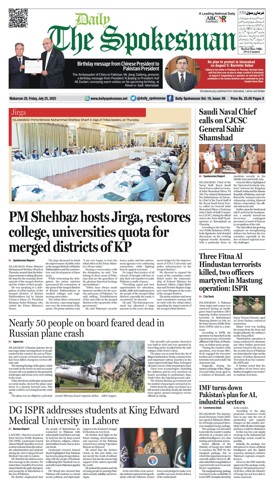 Daily The Spokesman PDF Daily The Spokesman 25 July 2025 PDF By News Desk July 25, 2025 0 390 Share FacebookTwitterPinterestWhatsAppLinkedinEmailTelegram Must read Daily The Spokesman 05 December 2025 PDF December 5, 2025 Wasim Aslam Appointed Coordinator to Chairman PMYP for Azad Jammu & Kashmir December 5, 2025 Hope 4 Humanity Gears Up for Pakistan Visit After Productive Meeting with High Commissioner December 4, 2025 Historic Visit: Pakistan and Kyrgyzstan Pen Agreements Across Energy, Mining, and Culture December 4, 2025 News Deskhttps://dailyspokesman.net/live Daily The Spokesman 25 July 2025 PDF TagsDaily The Spokesman 25 July 2025 PDF Share FacebookTwitterPinterestWhatsAppLinkedinEmailTelegram Previous articleMediation can provide pathway to resolving conflicts including KashmirNext articleUNESCO and Jazz Host Dialogue on AI Innovation Ecosystem in Pakistan - Advertisement - More articles Daily The Spokesman 05 December 2025 PDF December 5, 2025 Daily The Spokesman 04 December 2025 PDF December 4, 2025 Daily The Spokesman 03 December 2025 PDF December 3, 2025 - Advertisement - Latest article Daily The Spokesman 05 December 2025 PDF December 5, 2025 Wasim Aslam Appointed Coordinator to Chairman PMYP for Azad Jammu & Kashmir December 5, 2025 Hope 4 Humanity Gears Up for Pakistan Visit After Productive Meeting with High Commissioner December 4, 2025 Historic Visit: Pakistan and Kyrgyzstan Pen Agreements Across Energy, Mining, and Culture December 4, 2025 Daily The Spokesman 04 December 2025 PDF December 4, 2025