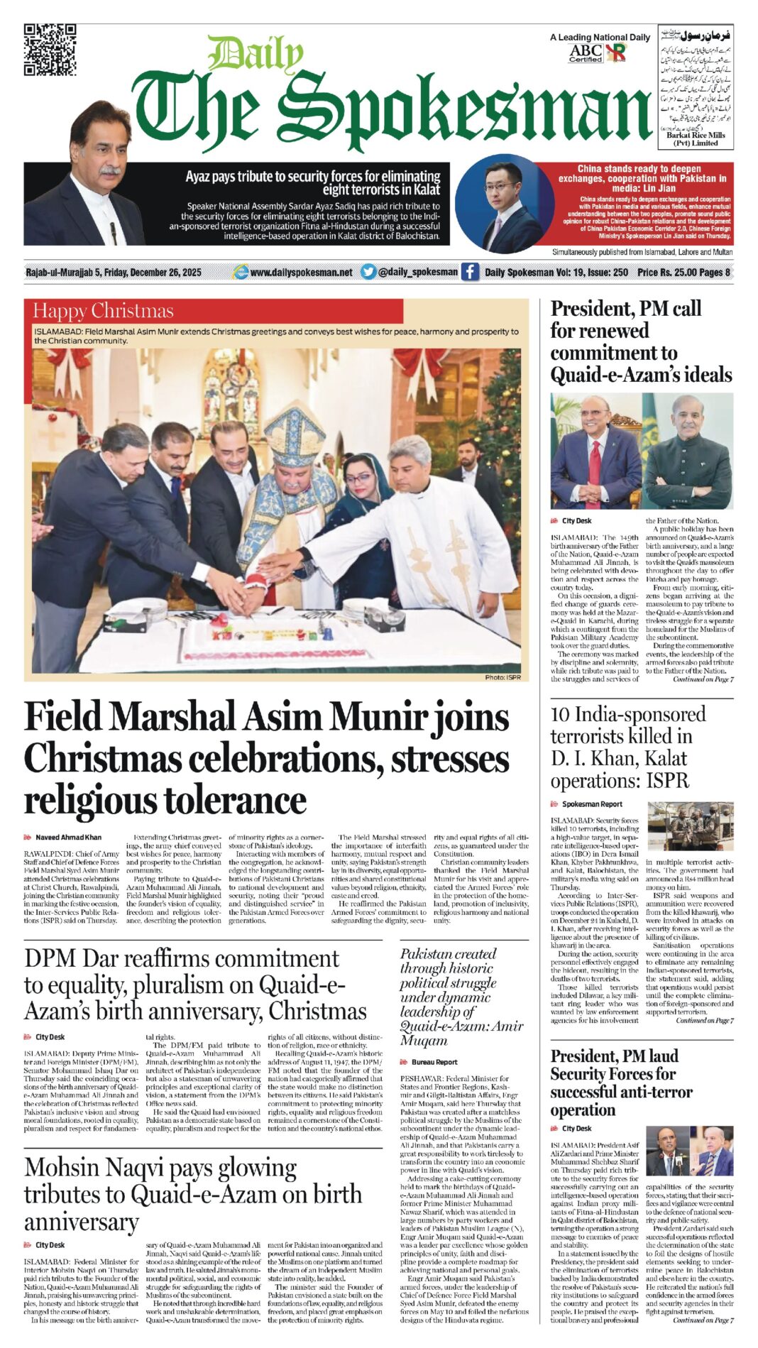 Daily The Spokesman PDF Daily The Spokesman 26 December 2025 PDF By News Desk December 26, 2025 0 56 Share FacebookTwitterPinterestWhatsAppLinkedinEmailTelegram Must read Legendary Pakistani Cricketer Shahid Khan Afridi visits TMUC, Islamabad January 8, 2026 China-US Reset Dominates Discussion at CASS Lahore Security Forum January 8, 2026 Field Marshal Munir Stresses Zero Tolerance for Security Threats During Lahore Visit January 8, 2026 Renowned Pakistani Artist Khalil Najmi Honors Ottawa High Commission with Jinnah Masterpiece January 8, 2026 News Deskhttps://dailyspokesman.net/live Daily The Spokesman 26 December 2025 PDF TagsDaily The Spokesman 26 December 2025 PDF Share FacebookTwitterPinterestWhatsAppLinkedinEmailTelegram Previous article Christmas, Islam, and the Lost Message of PeaceNext articleBenazir Bhutto’s biography, published by Lightstone Publishers - Advertisement - More articles Daily The Spokesman 08 January 2026 PDF January 8, 2026 Daily The Spokesman 07 January 2026 PDF January 7, 2026 Daily The Spokesman 06 January 2026 PDF January 6, 2026 - Advertisement - Latest article Legendary Pakistani Cricketer Shahid Khan Afridi visits TMUC, Islamabad January 8, 2026 China-US Reset Dominates Discussion at CASS Lahore Security Forum January 8, 2026 Field Marshal Munir Stresses Zero Tolerance for Security Threats During Lahore Visit January 8, 2026 Renowned Pakistani Artist Khalil Najmi Honors Ottawa High Commission with Jinnah Masterpiece January 8, 2026 Daily The Spokesman 08 January 2026 PDF January 8, 2026