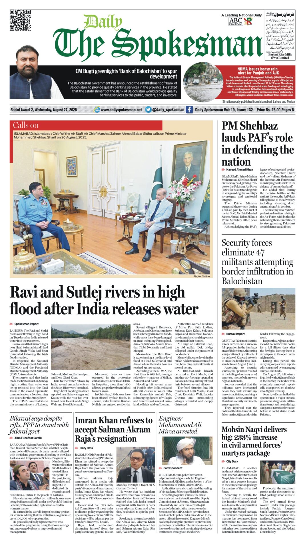 Daily The Spokesman PDF Daily The Spokesman 27 August 2025 PDF By News Desk August 27, 2025 0 698 Share FacebookTwitterPinterestWhatsAppLinkedinEmailTelegram Must read Daily The Spokesman 05 December 2025 PDF December 5, 2025 Wasim Aslam Appointed Coordinator to Chairman PMYP for Azad Jammu & Kashmir December 5, 2025 Hope 4 Humanity Gears Up for Pakistan Visit After Productive Meeting with High Commissioner December 4, 2025 Historic Visit: Pakistan and Kyrgyzstan Pen Agreements Across Energy, Mining, and Culture December 4, 2025 News Deskhttps://dailyspokesman.net/live Daily The Spokesman 27 August 2025 PDF TagsDaily The Spokesman 27 August 2025 PDF Share FacebookTwitterPinterestWhatsAppLinkedinEmailTelegram Previous articlePIA’s UK Operations Face Major SetbacksNext articleSECP’s rebuttals intensifies Rs14 billion scandal - Advertisement - More articles Daily The Spokesman 05 December 2025 PDF December 5, 2025 Daily The Spokesman 04 December 2025 PDF December 4, 2025 Daily The Spokesman 03 December 2025 PDF December 3, 2025 - Advertisement - Latest article Daily The Spokesman 05 December 2025 PDF December 5, 2025 Wasim Aslam Appointed Coordinator to Chairman PMYP for Azad Jammu & Kashmir December 5, 2025 Hope 4 Humanity Gears Up for Pakistan Visit After Productive Meeting with High Commissioner December 4, 2025 Historic Visit: Pakistan and Kyrgyzstan Pen Agreements Across Energy, Mining, and Culture December 4, 2025 Daily The Spokesman 04 December 2025 PDF December 4, 2025