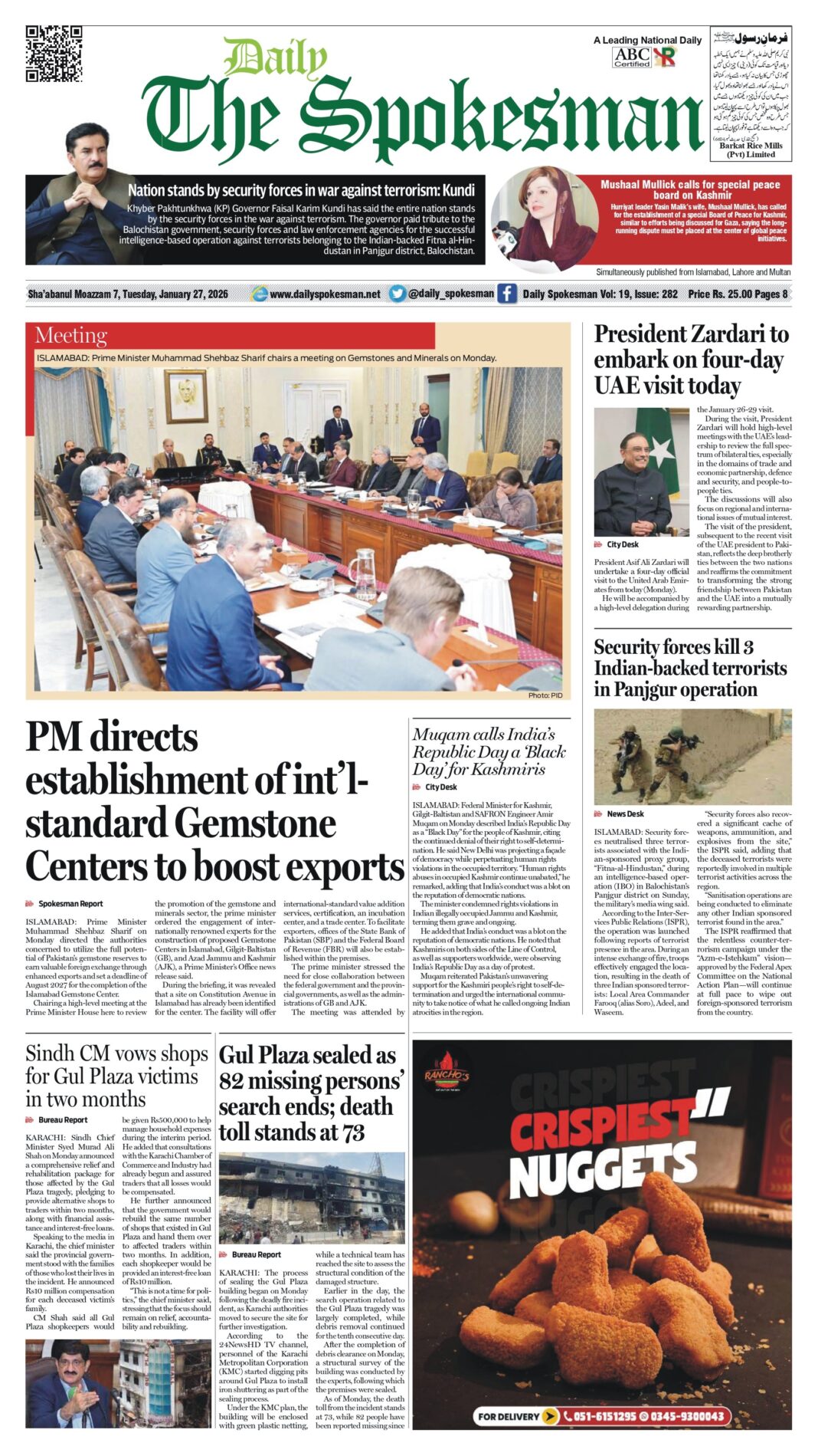 Daily The Spokesman PDF Daily The Spokesman 27 January 2026 PDF By News Desk January 27, 2026 0 1 Share FacebookTwitterPinterestWhatsAppLinkedinEmailTelegram Must read The British Council’s Women of the World Festival celebrates 10 years in Pakistan January 26, 2026 Daily The Spokesman 26 January 2026 PDF January 26, 2026 Kashmiris Mark India’s Republic Day as Black Day: A call for UN action on Jammu and Kashmir January 25, 2026 Daily The Spokesman 25 January 2026 PDF January 25, 2026 News Deskhttps://dailyspokesman.net/live E-paper Daily The Spokesman 27 January 2026 PDF TagsDaily The Spokesman 27 January 2026 PDF Share FacebookTwitterPinterestWhatsAppLinkedinEmailTelegram Previous articleThe British Council’s Women of the World Festival celebrates 10 years in Pakistan - Advertisement - More articles Daily The Spokesman 26 January 2026 PDF January 26, 2026 Daily The Spokesman 25 January 2026 PDF January 25, 2026 Daily The Spokesman 24 January 2026 PDF January 24, 2026 - Advertisement - Latest article The British Council’s Women of the World Festival celebrates 10 years in Pakistan January 26, 2026 Daily The Spokesman 26 January 2026 PDF January 26, 2026 Kashmiris Mark India’s Republic Day as Black Day: A call for UN action on Jammu and Kashmir January 25, 2026 Daily The Spokesman 25 January 2026 PDF January 25, 2026 Malaysia–Pakistan Education Ties Strengthened at EMGS Networking Reception in Islamabad January 24, 2026