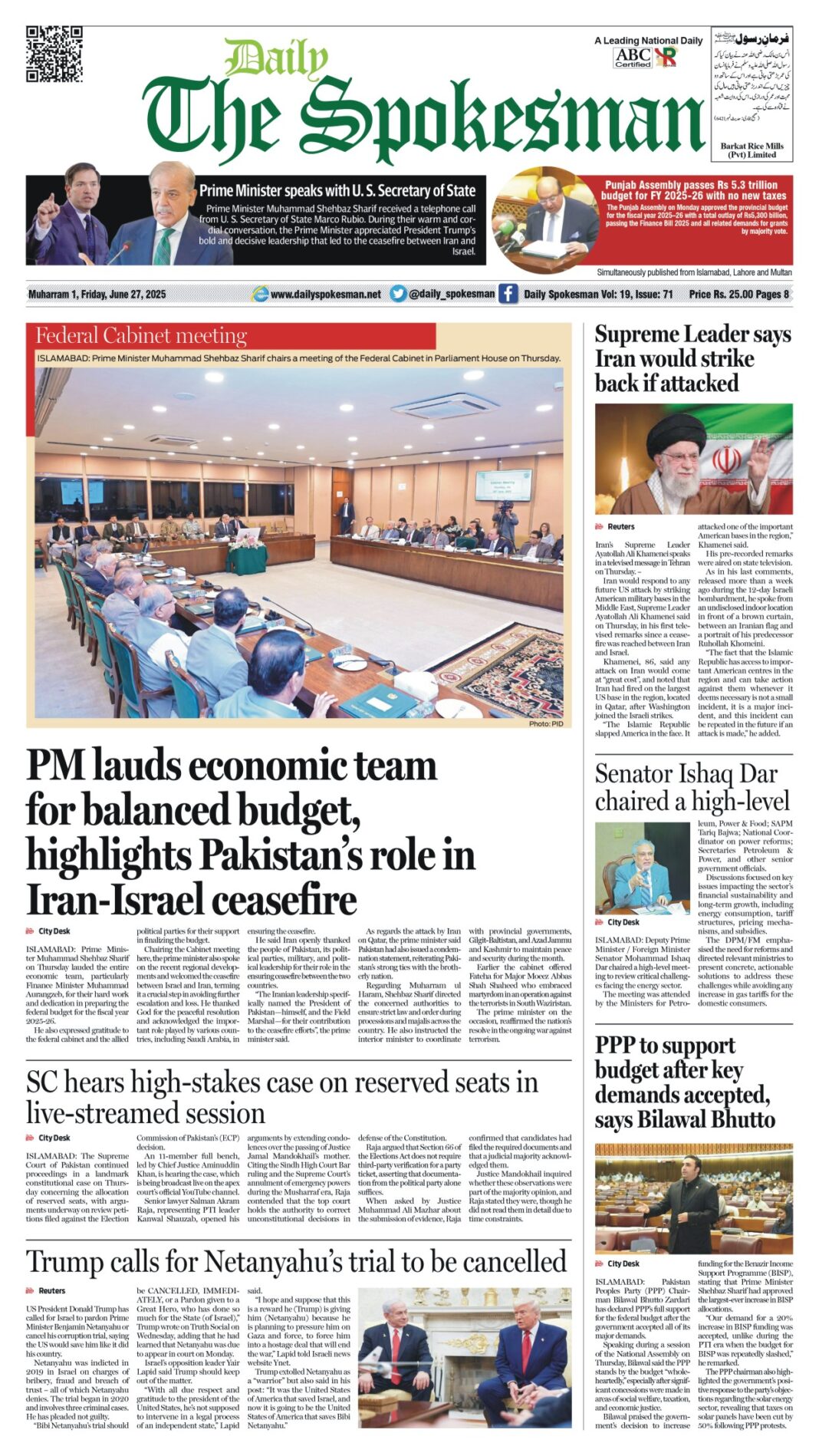 Daily The Spokesman PDF Daily The Spokesman 27 June 2025 PDF By News Desk June 27, 2025 0 478 Share FacebookTwitterPinterestWhatsAppLinkedinEmailTelegram Must read Daily The Spokesman 16 December 2025 PDF December 16, 2025 Kenya marks 62nd Jamhuri Day in Islamabad, Reaffirms strong ties with Pakistan December 15, 2025 Daily The Spokesman 15 December 2025 PDF December 15, 2025 Daily The Spokesman 14 December 2025 PDF December 14, 2025 News Deskhttps://dailyspokesman.net/live Daily The Spokesman 27 June 2025 PDF TagsDaily The Spokesman 27 June 2025 PDF Share FacebookTwitterPinterestWhatsAppLinkedinEmailTelegram Previous articleEthiopian Embassy Islamabad, UN Pakistan Coordinate for Food Systems Summit in Addis AbabaNext articleWHO, FAO and ADB join hands with Pakistan to strengthen pandemic prevention - Advertisement - More articles Daily The Spokesman 16 December 2025 PDF December 16, 2025 Daily The Spokesman 15 December 2025 PDF December 15, 2025 Daily The Spokesman 14 December 2025 PDF December 14, 2025 - Advertisement - Latest article Daily The Spokesman 16 December 2025 PDF December 16, 2025 Kenya marks 62nd Jamhuri Day in Islamabad, Reaffirms strong ties with Pakistan December 15, 2025 Daily The Spokesman 15 December 2025 PDF December 15, 2025 Daily The Spokesman 14 December 2025 PDF December 14, 2025 Field Marshal Munir Commends Pakistan Army’s Resolve Against Internal and External Challenges December 13, 2025