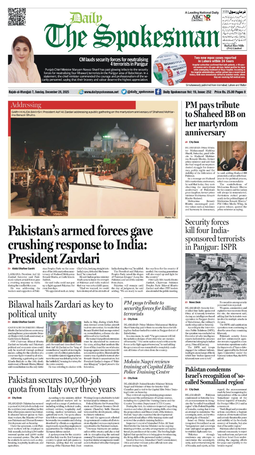 Daily The Spokesman PDF Daily The Spokesman 28 December 2025 PDF By News Desk December 28, 2025 0 60 Share FacebookTwitterPinterestWhatsAppLinkedinEmailTelegram Must read Daily The Spokesman 07 January 2026 PDF January 7, 2026 Digital Billboard Campaign in Washington Calls on United Nations to Honor Kashmiris’ Right to Self-Determination January 6, 2026 Daily The Spokesman 06 January 2026 PDF January 6, 2026 Daily The Spokesman 05 January 2026 PDF January 5, 2026 News Deskhttps://dailyspokesman.net/live Daily The Spokesman 28 December 2025 PDF TagsDaily The Spokesman 28 December 2025 PDF Share FacebookTwitterPinterestWhatsAppLinkedinEmailTelegram Previous articleHow Pakistan’s Military Diplomacy Reshaped South Asian Influence in 2025Next articleThe Enemy Within — and the American Habit of Fixing It - Advertisement - More articles Daily The Spokesman 07 January 2026 PDF January 7, 2026 Daily The Spokesman 06 January 2026 PDF January 6, 2026 Daily The Spokesman 05 January 2026 PDF January 5, 2026 - Advertisement - Latest article Daily The Spokesman 07 January 2026 PDF January 7, 2026 Digital Billboard Campaign in Washington Calls on United Nations to Honor Kashmiris’ Right to Self-Determination January 6, 2026 Daily The Spokesman 06 January 2026 PDF January 6, 2026 Daily The Spokesman 05 January 2026 PDF January 5, 2026 Ambassador Sohail Mahmood assumes charge of Secretary General of D-8 January 4, 2026