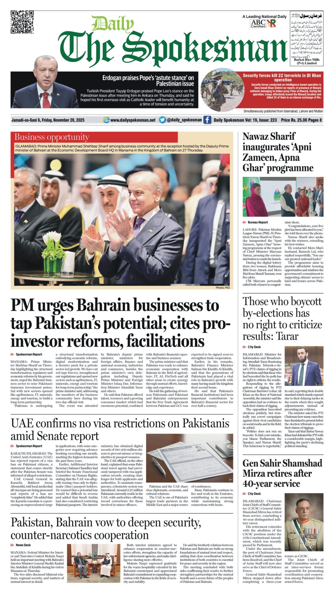 Daily The Spokesman PDF Daily The Spokesman 28 November 2025 PDF By News Desk November 28, 2025 0 19 Share FacebookTwitterPinterestWhatsAppLinkedinEmailTelegram Must read Wasim Aslam Appointed Coordinator to Chairman PMYP for Azad Jammu & Kashmir December 5, 2025 Hope 4 Humanity Gears Up for Pakistan Visit After Productive Meeting with High Commissioner December 4, 2025 Historic Visit: Pakistan and Kyrgyzstan Pen Agreements Across Energy, Mining, and Culture December 4, 2025 Daily The Spokesman 04 December 2025 PDF December 4, 2025 News Deskhttps://dailyspokesman.net/live Daily The Spokesman 28 November 2025 PDF TagsDaily The Spokesman 28 November 2025 PDF Share FacebookTwitterPinterestWhatsAppLinkedinEmailTelegram Previous articleDaily The Spokesman 27 November 2025 PDFNext articleAmbassador of Indonesia Officially Inaugurates Indonesian Corner at National Library of Pakistan - Advertisement - More articles Daily The Spokesman 04 December 2025 PDF December 4, 2025 Daily The Spokesman 03 December 2025 PDF December 3, 2025 Daily The Spokesman 02 December 2025 PDF December 2, 2025 - Advertisement - Latest article Wasim Aslam Appointed Coordinator to Chairman PMYP for Azad Jammu & Kashmir December 5, 2025 Hope 4 Humanity Gears Up for Pakistan Visit After Productive Meeting with High Commissioner December 4, 2025 Historic Visit: Pakistan and Kyrgyzstan Pen Agreements Across Energy, Mining, and Culture December 4, 2025 Daily The Spokesman 04 December 2025 PDF December 4, 2025 Fauji Cement Celebrates Record 5.4 Million Ton Sales at Annual Dealers Event December 3, 2025