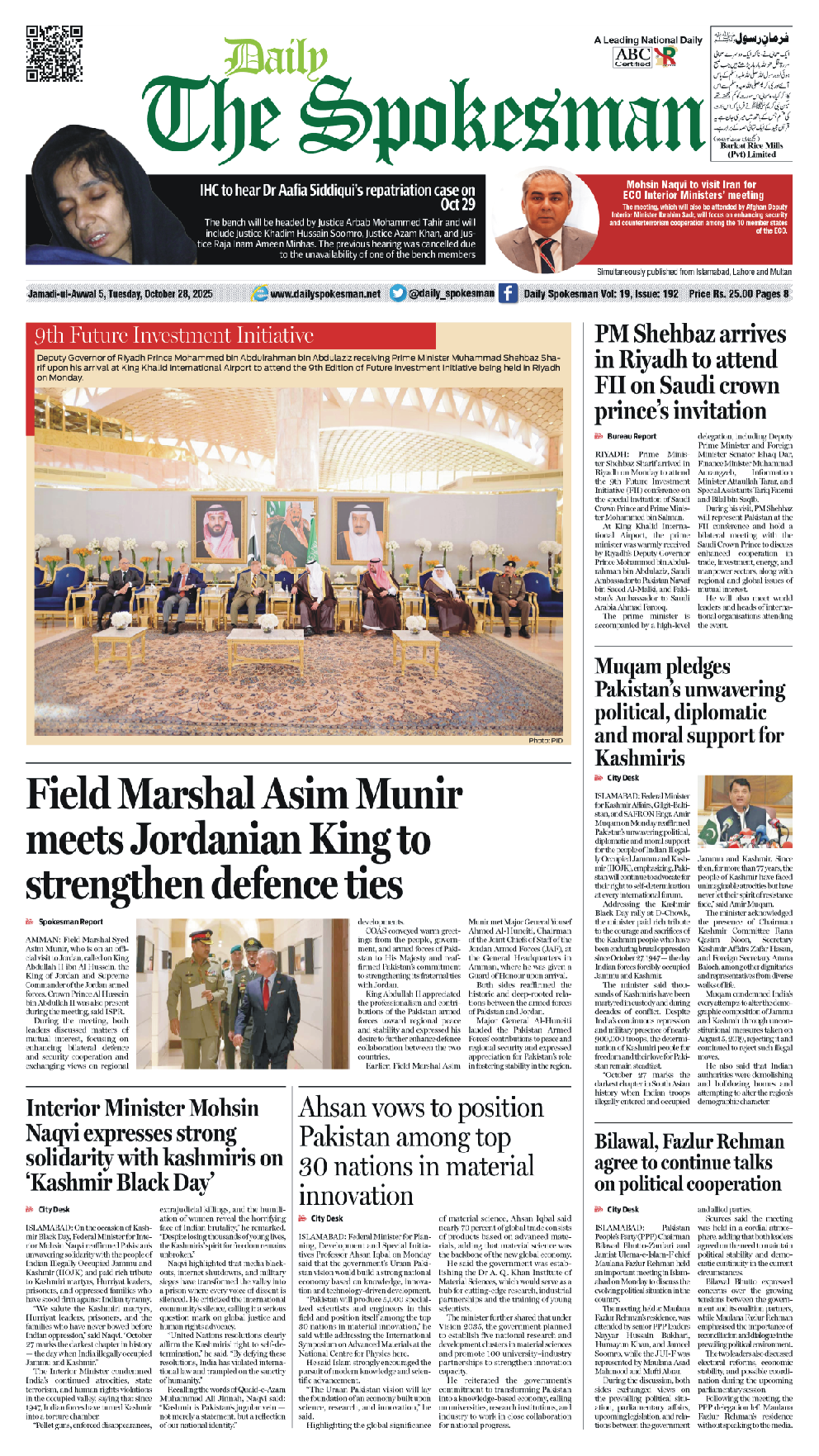 Daily The Spokesman PDF Daily The Spokesman 28 October 2025 PDF By News Desk October 28, 2025 0 62 Share FacebookTwitterPinterestWhatsAppLinkedinEmailTelegram Must read Daily The Spokesman 05 December 2025 PDF December 5, 2025 Wasim Aslam Appointed Coordinator to Chairman PMYP for Azad Jammu & Kashmir December 5, 2025 Hope 4 Humanity Gears Up for Pakistan Visit After Productive Meeting with High Commissioner December 4, 2025 Historic Visit: Pakistan and Kyrgyzstan Pen Agreements Across Energy, Mining, and Culture December 4, 2025 News Deskhttps://dailyspokesman.net/live Daily The Spokesman 28 October 2025 PDF TagsDaily The Spokesman 28 October 2025 PDF Share FacebookTwitterPinterestWhatsAppLinkedinEmailTelegram Previous articleAfter the Floods, Education Needs Stronger SupportNext articleDaily The Spokesman 29 October 2025 PDF - Advertisement - More articles Daily The Spokesman 05 December 2025 PDF December 5, 2025 Daily The Spokesman 04 December 2025 PDF December 4, 2025 Daily The Spokesman 03 December 2025 PDF December 3, 2025 - Advertisement - Latest article Daily The Spokesman 05 December 2025 PDF December 5, 2025 Wasim Aslam Appointed Coordinator to Chairman PMYP for Azad Jammu & Kashmir December 5, 2025 Hope 4 Humanity Gears Up for Pakistan Visit After Productive Meeting with High Commissioner December 4, 2025 Historic Visit: Pakistan and Kyrgyzstan Pen Agreements Across Energy, Mining, and Culture December 4, 2025 Daily The Spokesman 04 December 2025 PDF December 4, 2025