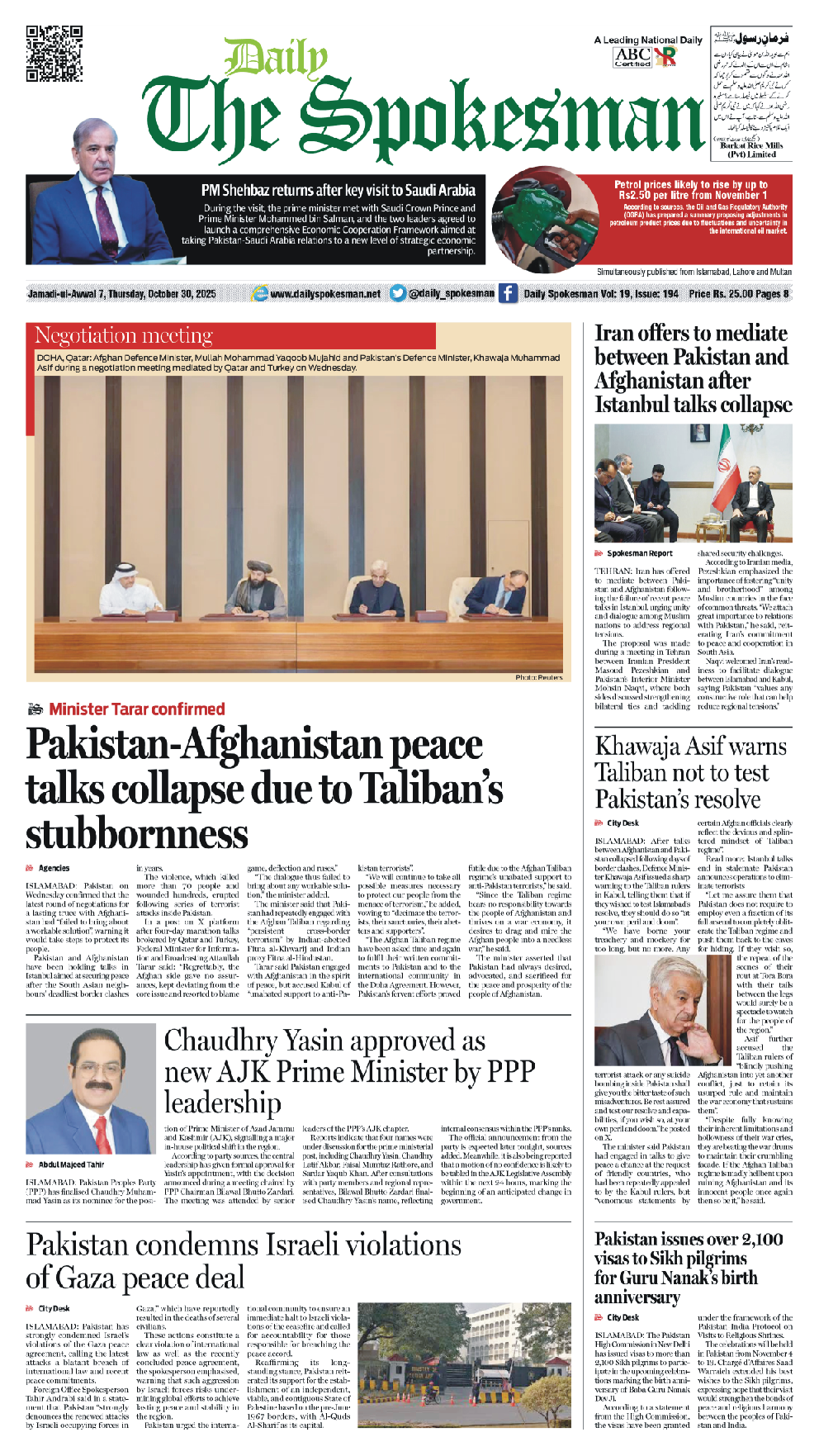 Daily The Spokesman PDF Daily The Spokesman 30 October 2025 PDF By News Desk October 30, 2025 0 77 Share FacebookTwitterPinterestWhatsAppLinkedinEmailTelegram Must read Daily The Spokesman 05 December 2025 PDF December 5, 2025 Wasim Aslam Appointed Coordinator to Chairman PMYP for Azad Jammu & Kashmir December 5, 2025 Hope 4 Humanity Gears Up for Pakistan Visit After Productive Meeting with High Commissioner December 4, 2025 Historic Visit: Pakistan and Kyrgyzstan Pen Agreements Across Energy, Mining, and Culture December 4, 2025 News Deskhttps://dailyspokesman.net/live Daily The Spokesman 30 October 2025 PDF TagsDaily The Spokesman 30 October 2025 PDF Share FacebookTwitterPinterestWhatsAppLinkedinEmailTelegram Previous articleDaily The Spokesman 29 October 2025 PDFNext articleReal Story Behind Pakistan-Afghanistan Tensions Over TTP - Advertisement - More articles Daily The Spokesman 05 December 2025 PDF December 5, 2025 Daily The Spokesman 04 December 2025 PDF December 4, 2025 Daily The Spokesman 03 December 2025 PDF December 3, 2025 - Advertisement - Latest article Daily The Spokesman 05 December 2025 PDF December 5, 2025 Wasim Aslam Appointed Coordinator to Chairman PMYP for Azad Jammu & Kashmir December 5, 2025 Hope 4 Humanity Gears Up for Pakistan Visit After Productive Meeting with High Commissioner December 4, 2025 Historic Visit: Pakistan and Kyrgyzstan Pen Agreements Across Energy, Mining, and Culture December 4, 2025 Daily The Spokesman 04 December 2025 PDF December 4, 2025