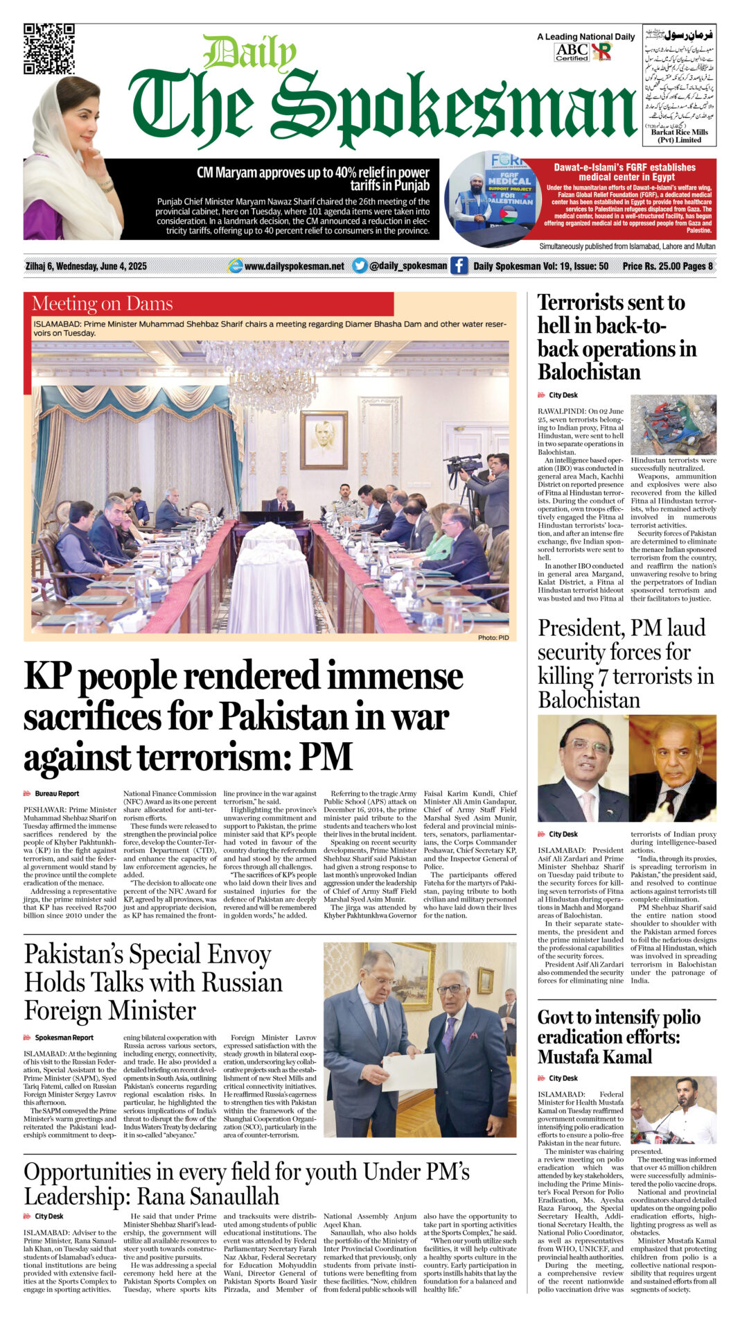Daily The Spokesman PDF Daily The Spokesman June 04 2025 PDF By News Desk June 4, 2025 0 534 Share FacebookTwitterPinterestWhatsAppLinkedinEmailTelegram Must read Daily The Spokesman 16 December 2025 PDF December 16, 2025 Kenya marks 62nd Jamhuri Day in Islamabad, Reaffirms strong ties with Pakistan December 15, 2025 Daily The Spokesman 15 December 2025 PDF December 15, 2025 Daily The Spokesman 14 December 2025 PDF December 14, 2025 News Deskhttps://dailyspokesman.net/live Daily The Spokesman June 04 2025 PDF TagsDaily The Spokesman June 04 2025 PDF Share FacebookTwitterPinterestWhatsAppLinkedinEmailTelegram Previous articleNCSW Condemns Brutal Murder of Young TikToker Sana YousafNext articlePEEF Awards Scholarships at Hashoo School of Hospitality Management - Advertisement - More articles Daily The Spokesman 16 December 2025 PDF December 16, 2025 Daily The Spokesman 15 December 2025 PDF December 15, 2025 Daily The Spokesman 14 December 2025 PDF December 14, 2025 - Advertisement - Latest article Daily The Spokesman 16 December 2025 PDF December 16, 2025 Kenya marks 62nd Jamhuri Day in Islamabad, Reaffirms strong ties with Pakistan December 15, 2025 Daily The Spokesman 15 December 2025 PDF December 15, 2025 Daily The Spokesman 14 December 2025 PDF December 14, 2025 Field Marshal Munir Commends Pakistan Army’s Resolve Against Internal and External Challenges December 13, 2025