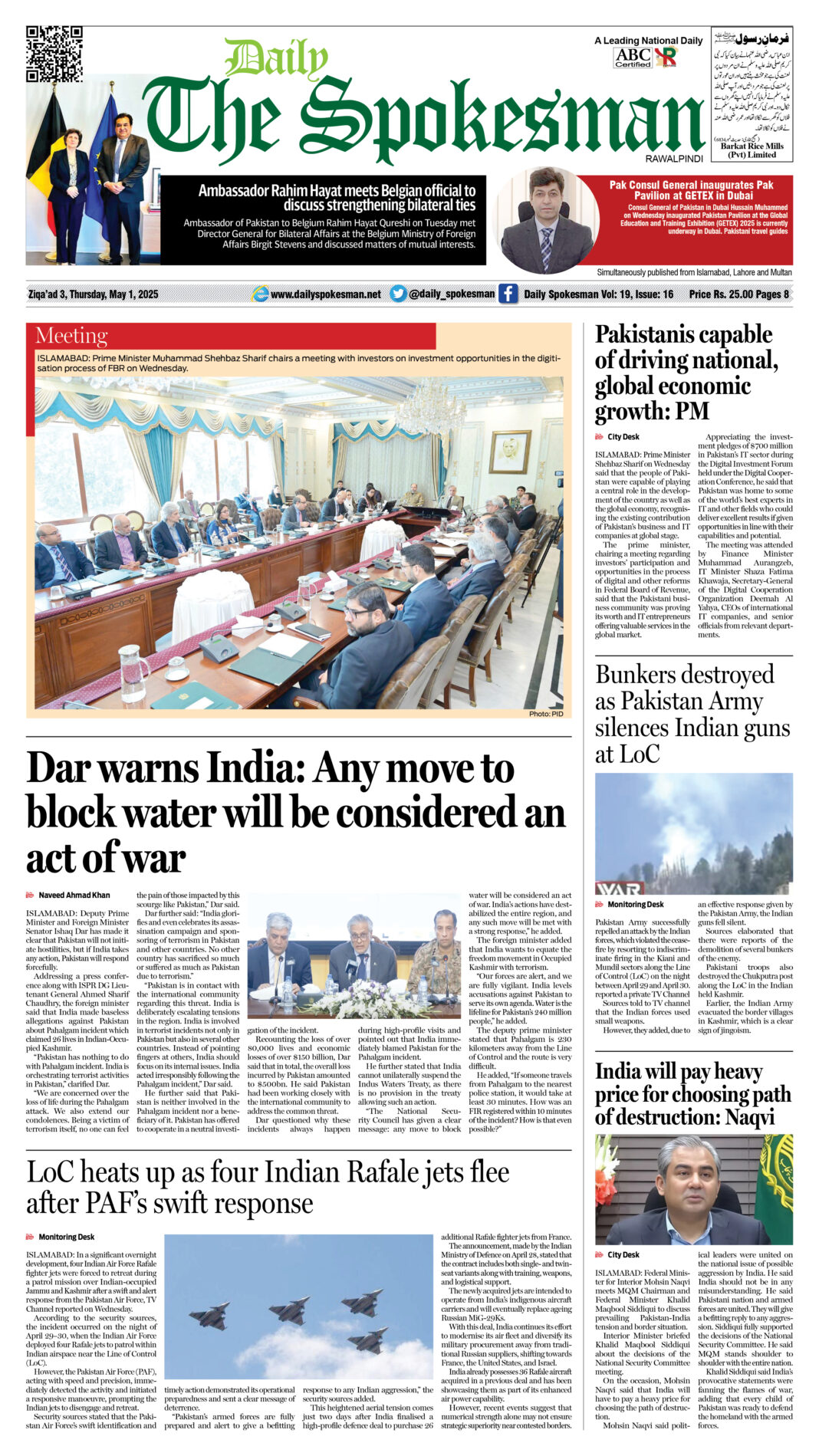 Daily The Spokesman PDF Daily The Spokesman May 01 2025 PDF By News Desk May 1, 2025 0 438 Share FacebookTwitterPinterestWhatsAppLinkedinEmailTelegram Must read Daily The Spokesman 17 December 2025 PDF December 17, 2025 Daily The Spokesman 16 December 2025 PDF December 16, 2025 Kenya marks 62nd Jamhuri Day in Islamabad, Reaffirms strong ties with Pakistan December 15, 2025 Daily The Spokesman 15 December 2025 PDF December 15, 2025 News Deskhttps://dailyspokesman.net/live Daily The Spokesman May 01 2025 PDF TagsDaily The Spokesman May 01 2025 PDF Share FacebookTwitterPinterestWhatsAppLinkedinEmailTelegram Previous articleDar Warns India: Any Move to Block Water Will Be Considered an Act of WarNext articleProminent UK-Based Pakistani Sajid Abbas Chadhar Honorably Acquitted in False Murder Case - Advertisement - More articles Daily The Spokesman 17 December 2025 PDF December 17, 2025 Daily The Spokesman 16 December 2025 PDF December 16, 2025 Daily The Spokesman 15 December 2025 PDF December 15, 2025 - Advertisement - Latest article Daily The Spokesman 17 December 2025 PDF December 17, 2025 Daily The Spokesman 16 December 2025 PDF December 16, 2025 Kenya marks 62nd Jamhuri Day in Islamabad, Reaffirms strong ties with Pakistan December 15, 2025 Daily The Spokesman 15 December 2025 PDF December 15, 2025 Daily The Spokesman 14 December 2025 PDF December 14, 2025