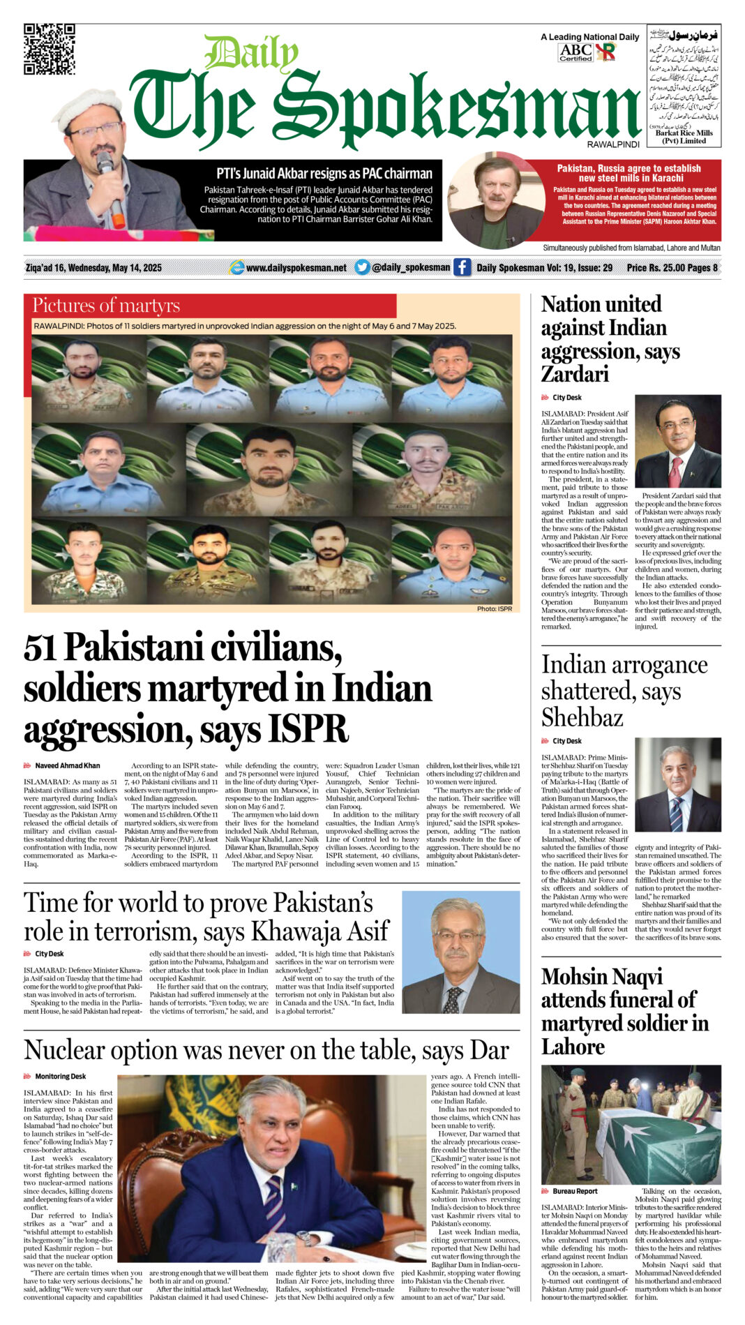 Daily The Spokesman PDF Daily The Spokesman May 14 2025 PDF By News Desk May 14, 2025 0 482 Share FacebookTwitterPinterestWhatsAppLinkedinEmailTelegram Must read Daily The Spokesman 17 December 2025 PDF December 17, 2025 Daily The Spokesman 16 December 2025 PDF December 16, 2025 Kenya marks 62nd Jamhuri Day in Islamabad, Reaffirms strong ties with Pakistan December 15, 2025 Daily The Spokesman 15 December 2025 PDF December 15, 2025 News Deskhttps://dailyspokesman.net/live Daily The Spokesman May 14 2025 PDF TagsDaily The Spokesman May 14 2025 PDF Share FacebookTwitterPinterestWhatsAppLinkedinEmailTelegram Previous articleDaily The Spokesman May 13 2025 PDFNext articleUS President Offers Trade Incentives to Pakistan and India for Halting Hostilities - Advertisement - More articles Daily The Spokesman 17 December 2025 PDF December 17, 2025 Daily The Spokesman 16 December 2025 PDF December 16, 2025 Daily The Spokesman 15 December 2025 PDF December 15, 2025 - Advertisement - Latest article Daily The Spokesman 17 December 2025 PDF December 17, 2025 Daily The Spokesman 16 December 2025 PDF December 16, 2025 Kenya marks 62nd Jamhuri Day in Islamabad, Reaffirms strong ties with Pakistan December 15, 2025 Daily The Spokesman 15 December 2025 PDF December 15, 2025 Daily The Spokesman 14 December 2025 PDF December 14, 2025