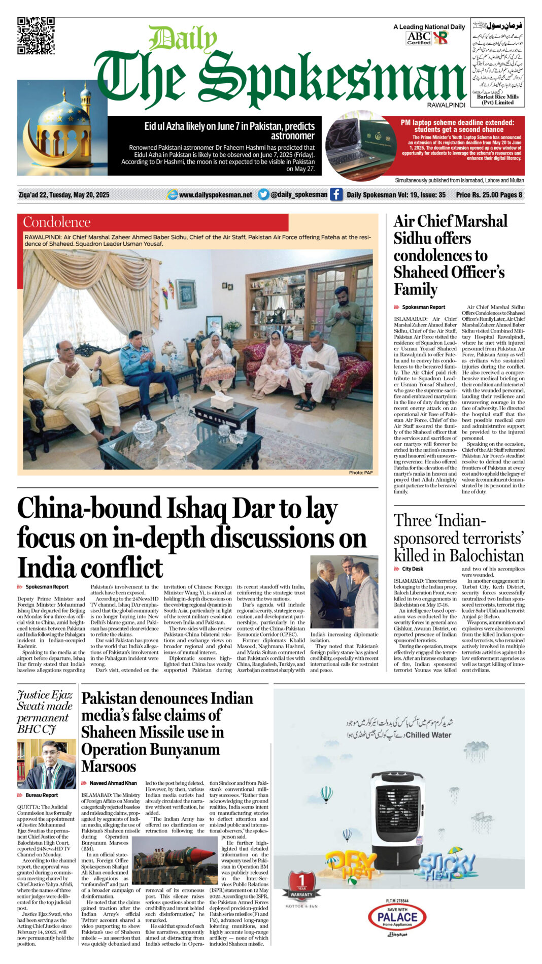 Daily The Spokesman PDF Daily The Spokesman May 20 2025 PDF By News Desk May 20, 2025 0 459 Share FacebookTwitterPinterestWhatsAppLinkedinEmailTelegram Must read Daily The Spokesman 05 December 2025 PDF December 5, 2025 Wasim Aslam Appointed Coordinator to Chairman PMYP for Azad Jammu & Kashmir December 5, 2025 Hope 4 Humanity Gears Up for Pakistan Visit After Productive Meeting with High Commissioner December 4, 2025 Historic Visit: Pakistan and Kyrgyzstan Pen Agreements Across Energy, Mining, and Culture December 4, 2025 News Deskhttps://dailyspokesman.net/live Daily The Spokesman May 20 2025 PDF TagsDaily The Spokesman May 20 2025 PDF Share FacebookTwitterPinterestWhatsAppLinkedinEmailTelegram Previous articlePakistan receives recognition for its contribution to global healthNext articleDar and Liu Discuss Regional Peace and Stability Amidst Pakistan-India Ceasefire - Advertisement - More articles Daily The Spokesman 05 December 2025 PDF December 5, 2025 Daily The Spokesman 04 December 2025 PDF December 4, 2025 Daily The Spokesman 03 December 2025 PDF December 3, 2025 - Advertisement - Latest article Daily The Spokesman 05 December 2025 PDF December 5, 2025 Wasim Aslam Appointed Coordinator to Chairman PMYP for Azad Jammu & Kashmir December 5, 2025 Hope 4 Humanity Gears Up for Pakistan Visit After Productive Meeting with High Commissioner December 4, 2025 Historic Visit: Pakistan and Kyrgyzstan Pen Agreements Across Energy, Mining, and Culture December 4, 2025 Daily The Spokesman 04 December 2025 PDF December 4, 2025
