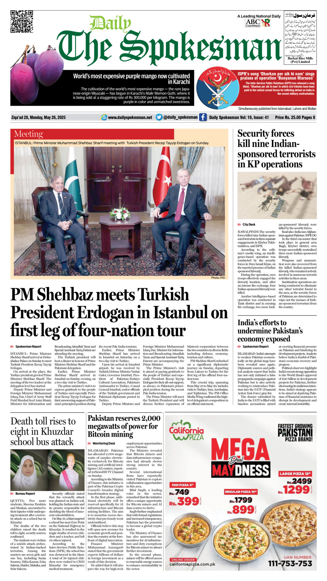 Daily The Spokesman PDF Daily The Spokesman May 26 2025 PDF By News Desk May 26, 2025 0 478 Share FacebookTwitterPinterestWhatsAppLinkedinEmailTelegram Must read Daily The Spokesman 05 December 2025 PDF December 5, 2025 Wasim Aslam Appointed Coordinator to Chairman PMYP for Azad Jammu & Kashmir December 5, 2025 Hope 4 Humanity Gears Up for Pakistan Visit After Productive Meeting with High Commissioner December 4, 2025 Historic Visit: Pakistan and Kyrgyzstan Pen Agreements Across Energy, Mining, and Culture December 4, 2025 News Deskhttps://dailyspokesman.net/live Daily The Spokesman May 26 2025 PDF TagsDaily The Spokesman May 26 2025 PDF Share FacebookTwitterPinterestWhatsAppLinkedinEmailTelegram Previous article ‘Independence Day’ of Azerbaijan represents declaration of sovereignty spirit of resilience: Ambassador FarhadovNext articleIran to boost cooperation in trade and investment: PM Shehbaz - Advertisement - More articles Daily The Spokesman 05 December 2025 PDF December 5, 2025 Daily The Spokesman 04 December 2025 PDF December 4, 2025 Daily The Spokesman 03 December 2025 PDF December 3, 2025 - Advertisement - Latest article Daily The Spokesman 05 December 2025 PDF December 5, 2025 Wasim Aslam Appointed Coordinator to Chairman PMYP for Azad Jammu & Kashmir December 5, 2025 Hope 4 Humanity Gears Up for Pakistan Visit After Productive Meeting with High Commissioner December 4, 2025 Historic Visit: Pakistan and Kyrgyzstan Pen Agreements Across Energy, Mining, and Culture December 4, 2025 Daily The Spokesman 04 December 2025 PDF December 4, 2025