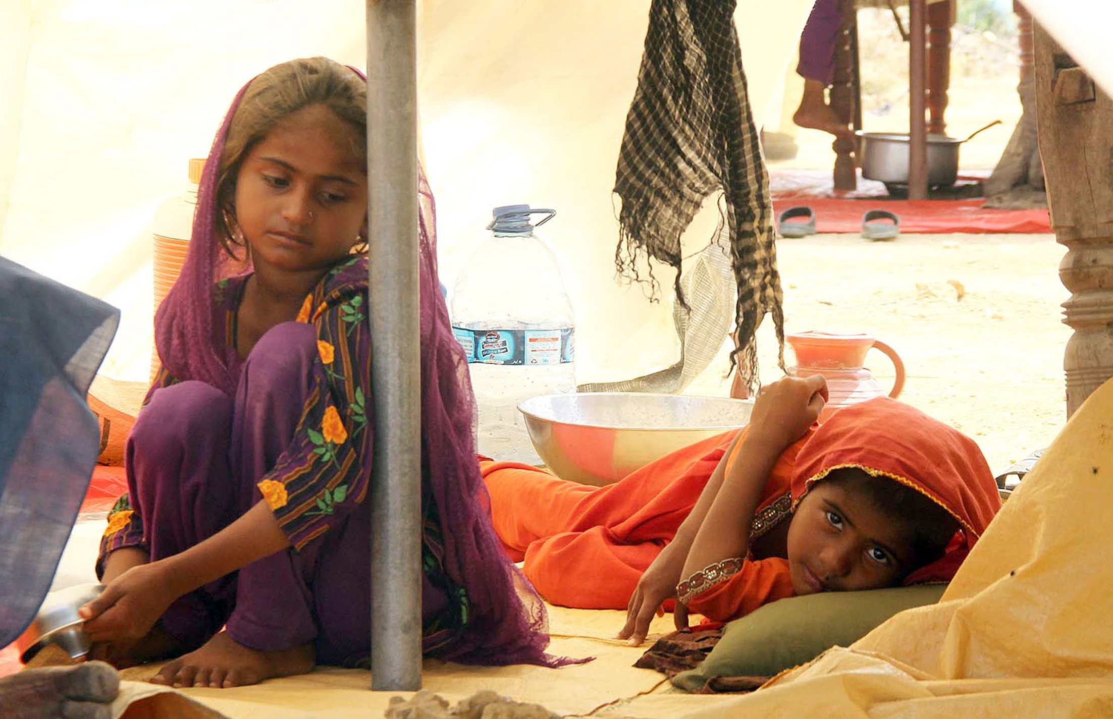 Pic15-033 HYDERABAD-Sep15: Flood effected children sits worried in a temporary makeshift alongside a road, in the city. ONLINE PHOTO by Nadeem Khawar