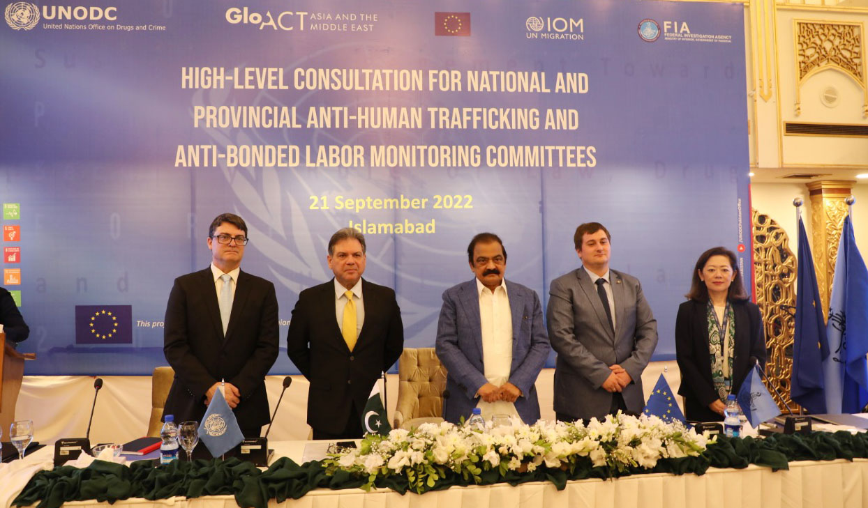 Islamabad – Under the EU-funded GLO.ACT – Global Action to Address Trafficking in Persons and the Smuggling of Migrants (GLO.ACT – Asia and the Middle East), the United Nations Office on Drugs and Crime (UNODC), in collaboration with the Federal Investigation Agency, organized a high-level consultation workshop for National and Provincial Anti-Human Trafficking Committees on 21 September 2022.