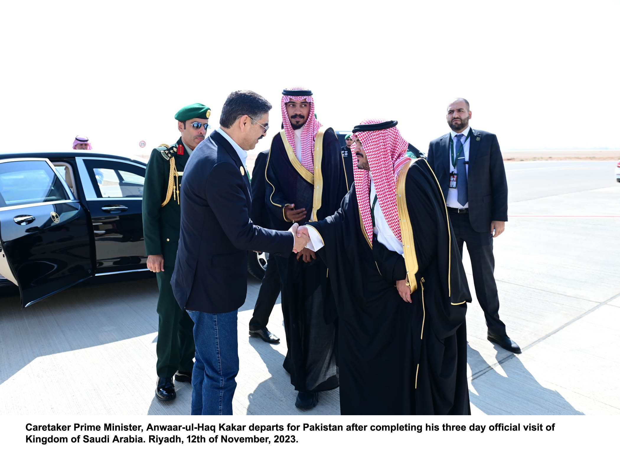 Caretaker Prime Minister Anwaar-ul-Haq Kakar on Sunday arrived here after completing his three-day official visit to the Kingdom of Saudi Arabia where he attended Arab-Islamic Extraordinary Summit in Riyadh over the Gaza situation. Earlier, at the King Khalid International Airport, the prime minister was seen off by the high diplomatic officials of Pakistan and Saudi Arabia. |