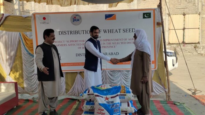 Islamabad:Japan International Cooperation Agency (JICA) Pakistan office provided 12,500 certified wheat seed bags to flood affected farmers of five districts Nasirabad, Jaffarabad, Soubatpur, Jal Magsi and Kacchi in Balochistan Province. The Japanese assistance enables 2,500 flood affected farmers families to cultivate wheat crop on their 12,500 acres of land during this Rabi season which will ultimately ensure the food security through availability of sufficient wheat yield in next harvesting season.