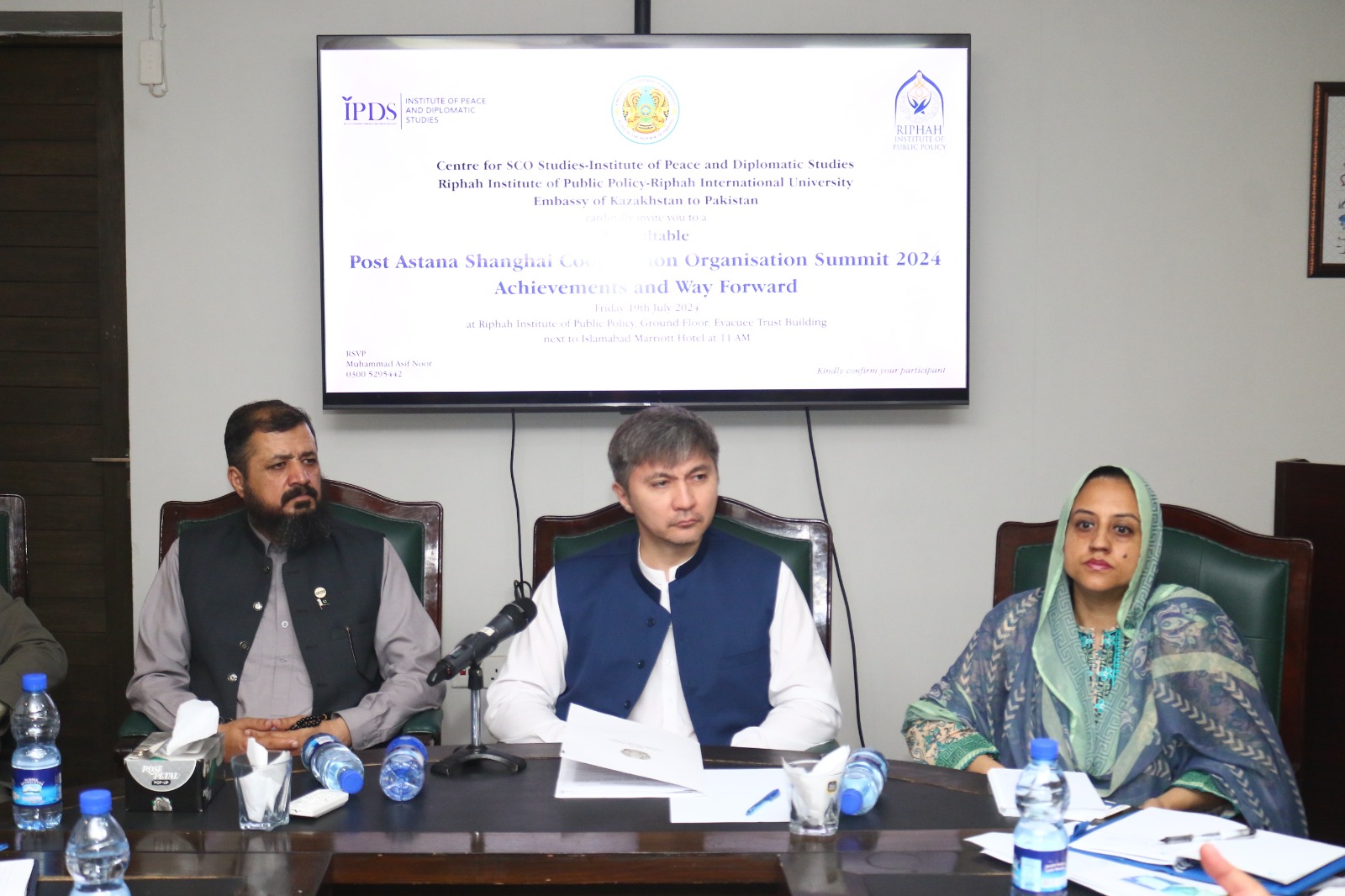Islamabad: Center for SCO Studies- Institute of Peace and Diplomatic Studies, The Riphah Institute of Public Policy (RIPP), in collaboration with the Embassy of Kazakhstan to Pakistan hosted a roundtable on “Post Astana Shanghai Cooperation Organization Summit 2024: Achievements and Way Forward.”