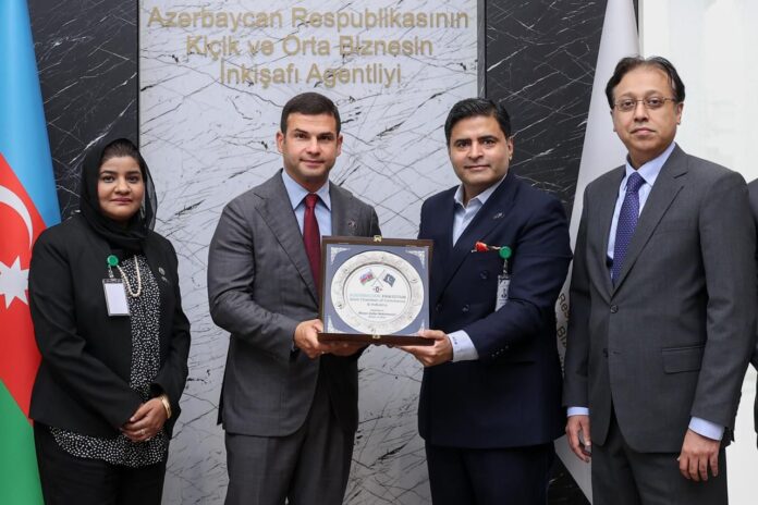 Baku : The Azerbaijan-Pakistan Joint Chamber of Commerce and Industry (APJCCI) and the Small and Medium Business Development Agency of Azerbaijan (KOBIA) have agreed to promote SME cooperation between Pakistan and Azerbaijan. A delegation led by APJCCI Patron-in-Chief Ahsan Bakhtawari met with KOBIA Chairman Orkhan Mammadov. Pakistan’s Ambassador to Azerbaijan, Qasim Moinuddin, was also present on the occasion. During the meeting, both sides discussed exploring opportunities for collaboration in the SME sector between the two countries. Welcoming the delegation, KOBIA Chairman Orkhan Mammadov said that APJCCI serves as an effective platform for strengthening economic relations between the two countries. He identified agriculture, tourism, pharmaceuticals, IT, food processing, and construction as promising sectors for cooperation. He invited Pakistani businessmen to participate in the upcoming “Halal Business Forum” scheduled for October and informed that KOBIA will also send an Azerbaijani delegation to Pakistan later this year to sign Memorandums of Understanding (MoUs) in various sectors. He added that KOBIA’s SME Friend Service Centers are providing entrepreneurs with services related to registration, licensing, taxation, customs, and consultancy to further facilitate business activities.