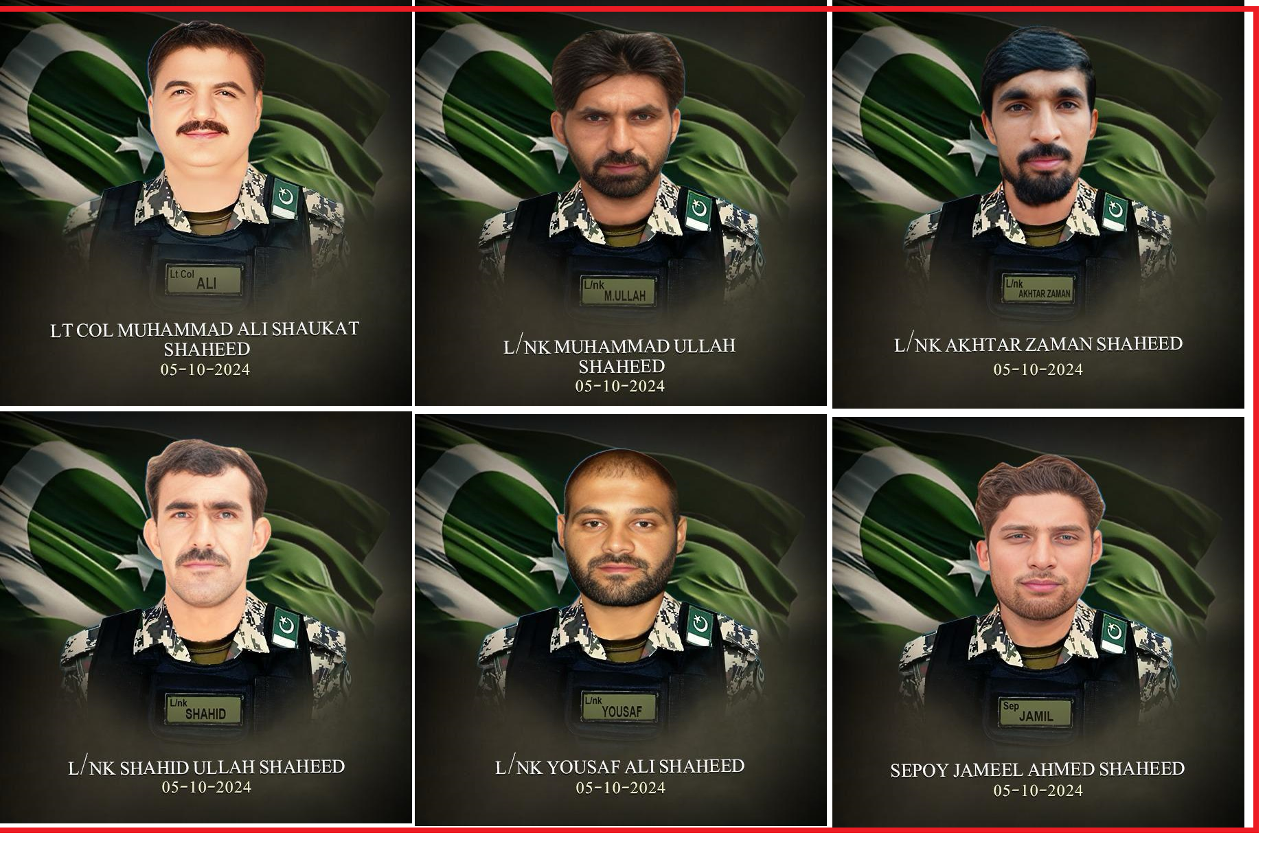 However, during the intense fire exchange, Lieutenant Colonel Muhammad Ali Shoukat (Age: 43 years, resident of: District Faisalabad), a brave officer who was leading his troops from the front, fought gallantly and embraced shahadat along with his five men. The five brave soldiers who paid the ultimate sacrifice include Lance Naik Muhammad Ullah (age: 31 Years, resident of District Khyber), Lance Naik Akhtar Zaman (age: 30 years, resident of District Lakki Marwat), Lance Naik Shahid Ullah (age:29 years, resident of District Tank) and Lance Naik Yusaf Ali (age:31 years, resident of District Orkazai), Sepoy Jameel Ahmed (age:26 years, resident of District Swat).